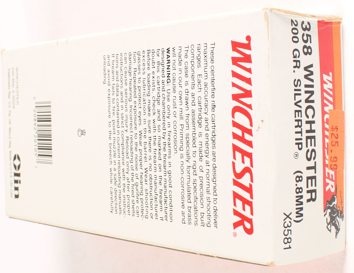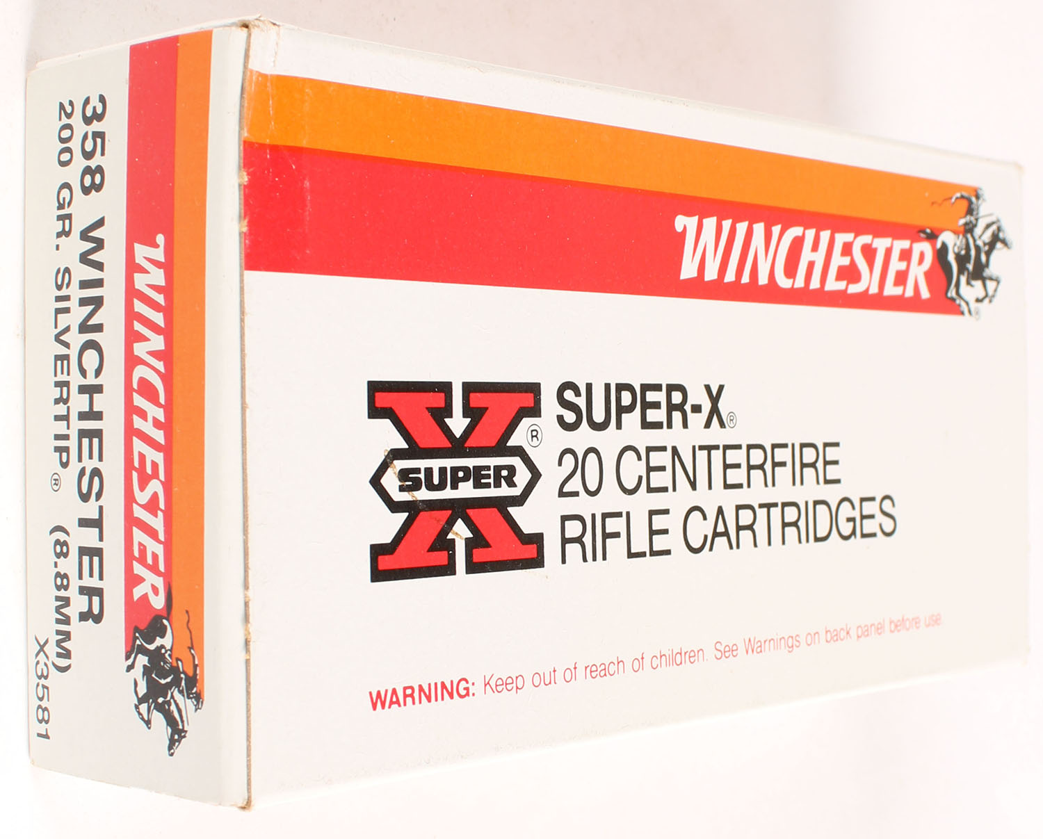 Winchester, Super-X, .358 Winchester, 200 Gr. Silvertip, Full, 1pc. Gray red & orange box, box is solid with excellent to minty color, very minor corner wear, edges are crisp, end flaps are solid, ammo is excellent. Grade: Excellent ++ - Value: 20 to 60