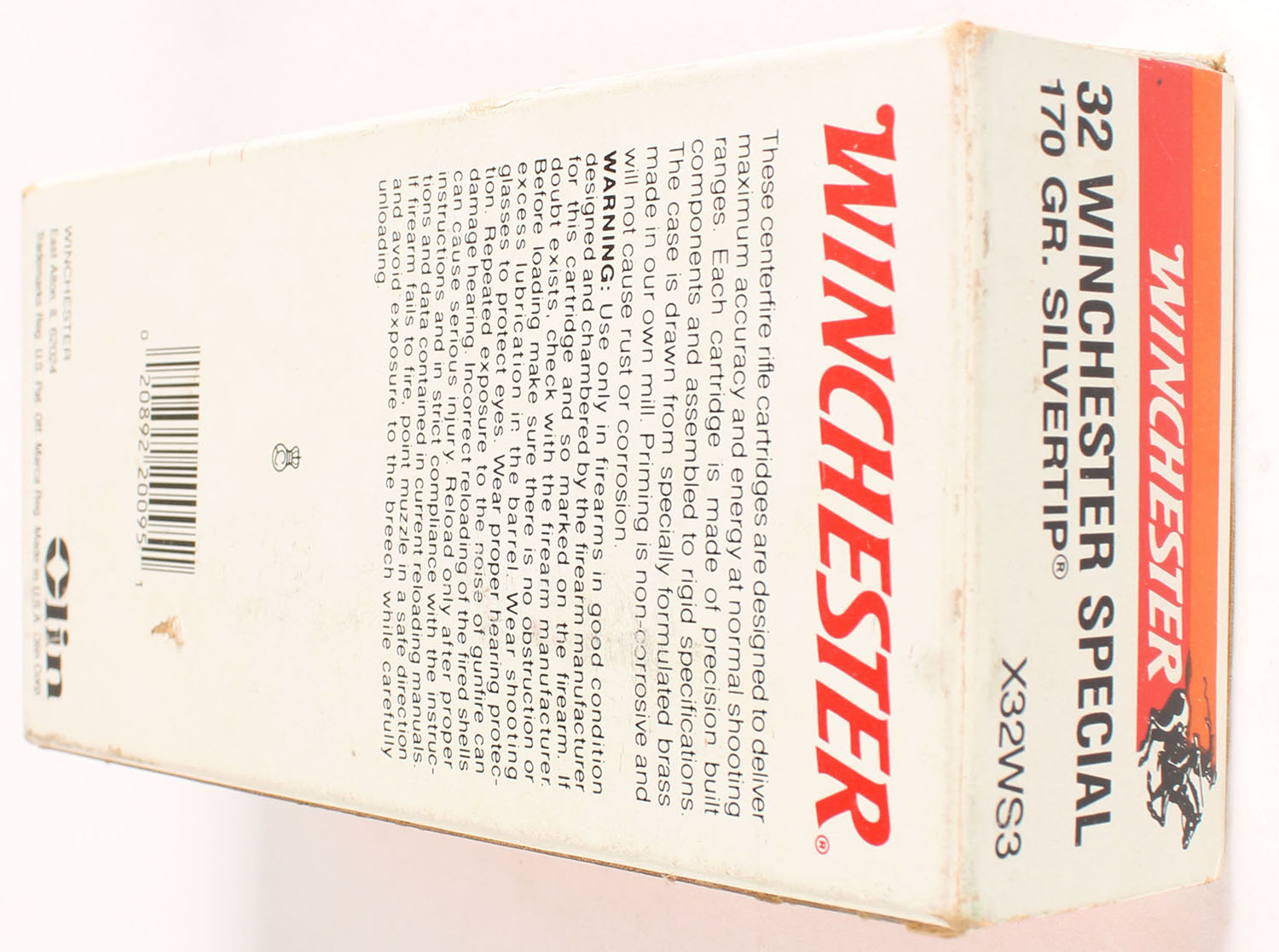 Winchester, Super-X, .32 Winchester Special, 170 Gr. Silvertip, Full of incorrect ammo, 1pc. White red & orange box, box is solid with excellent color, very minor age soiling & corner wear, very minor edge wear, top has been written on, end flaps are solid, ammo is excellent. Grade: Excellent - Value: 16 to 60