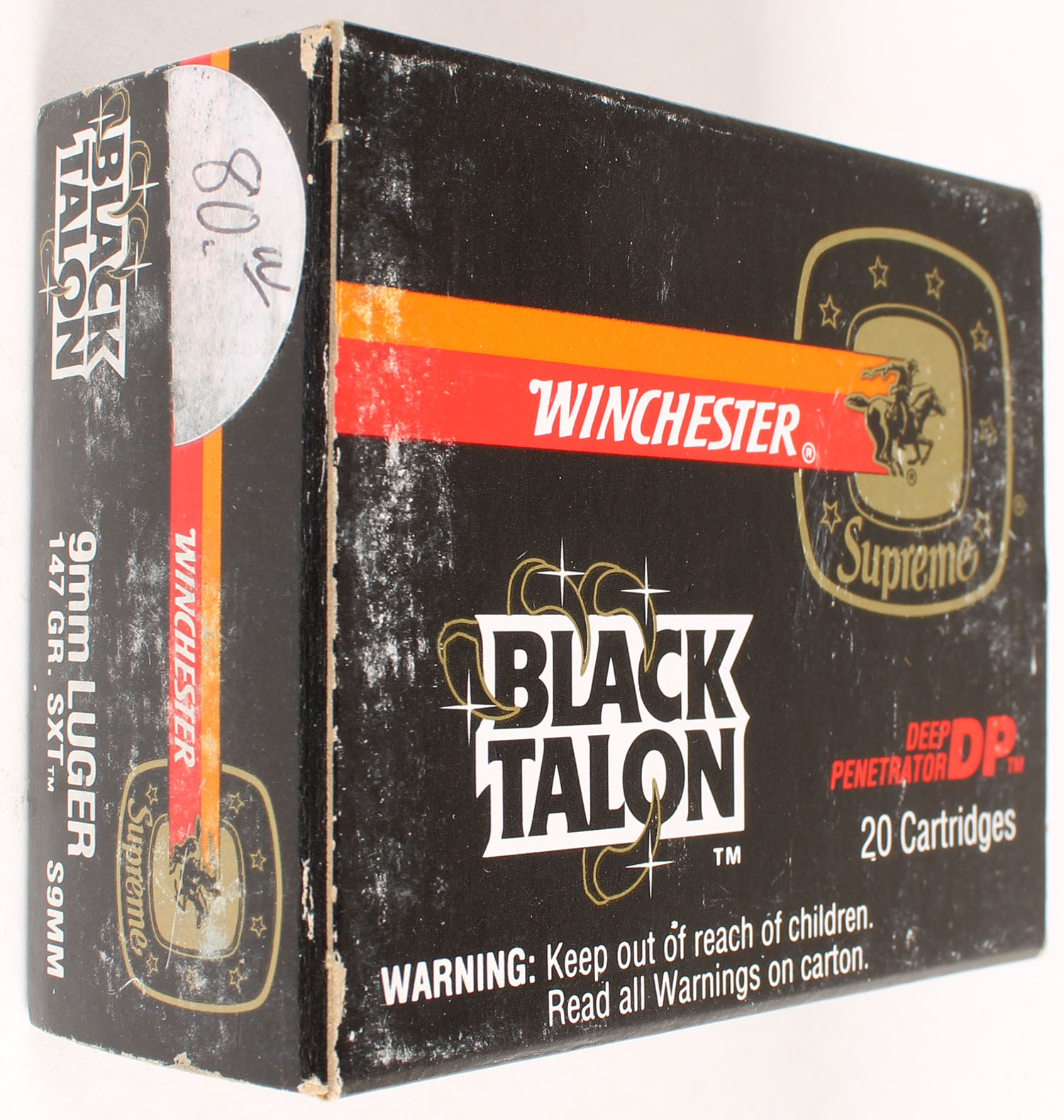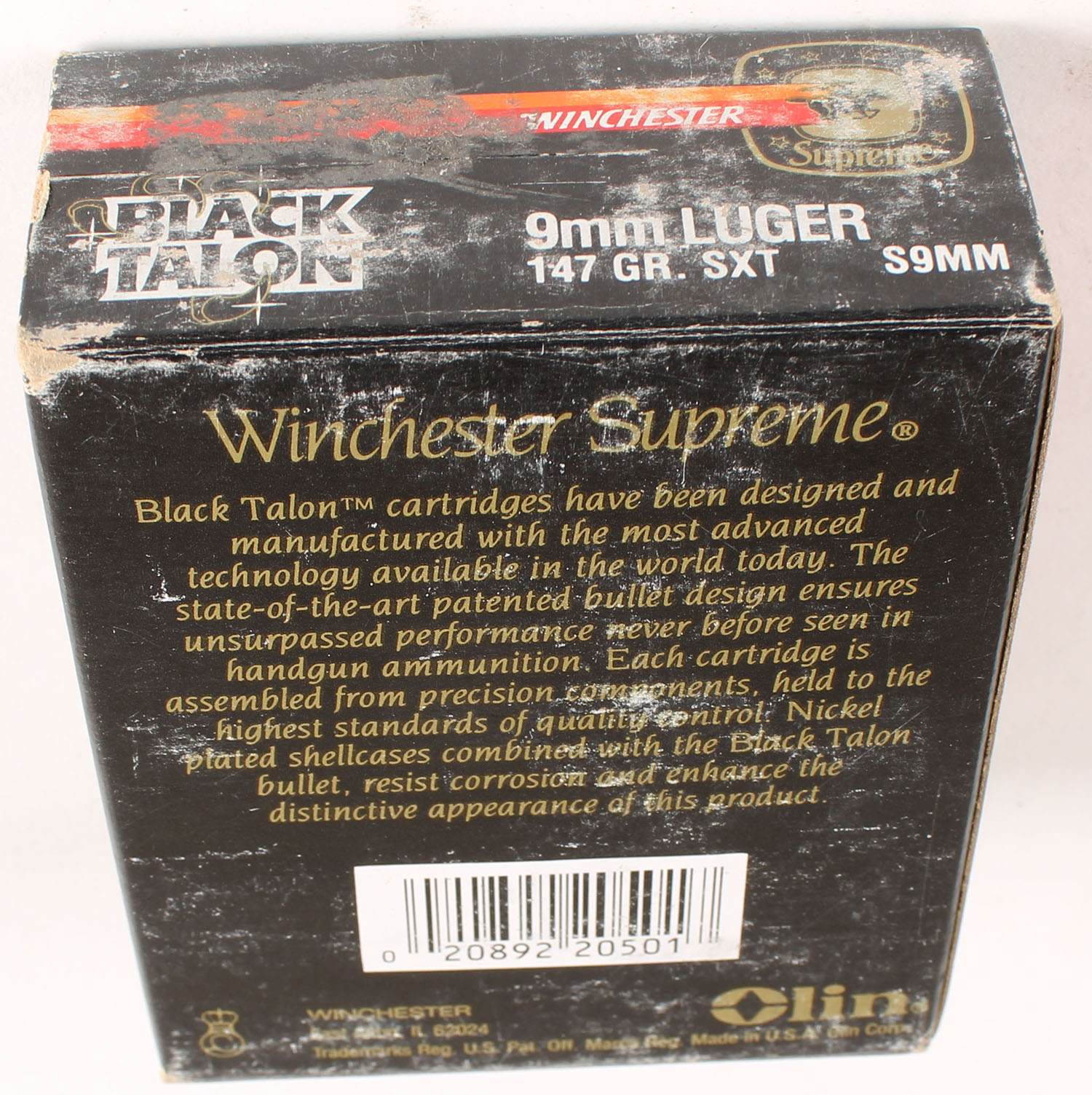Winchester, Black Talon, 9mm Luger, 147 Gr. SXT, Full, 1pc. Black red & orange box, box is solid with excellent color, some shelf wear, very minor corner wear, edges are crisp, end flaps are solid, ammo is minty. Grade: Excellent + - Value: 20 to 60