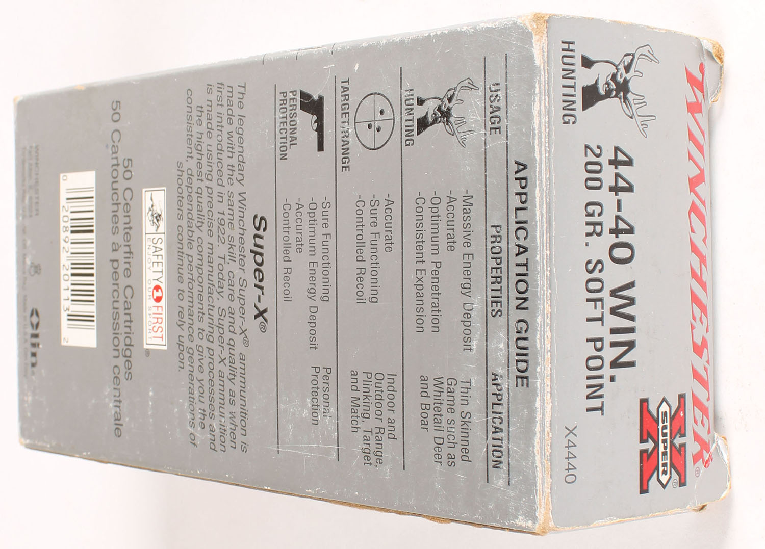 Winchester, Super-X, .44-40 Winchester, 200 Gr. Soft Point, Full, 1pc. Silver & red box, box is near mint with minty color, only very minor edge & corner wear, ammo is minty. Grade: Excellent ++ - Value: 60 to 180