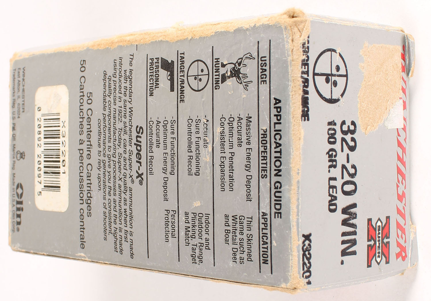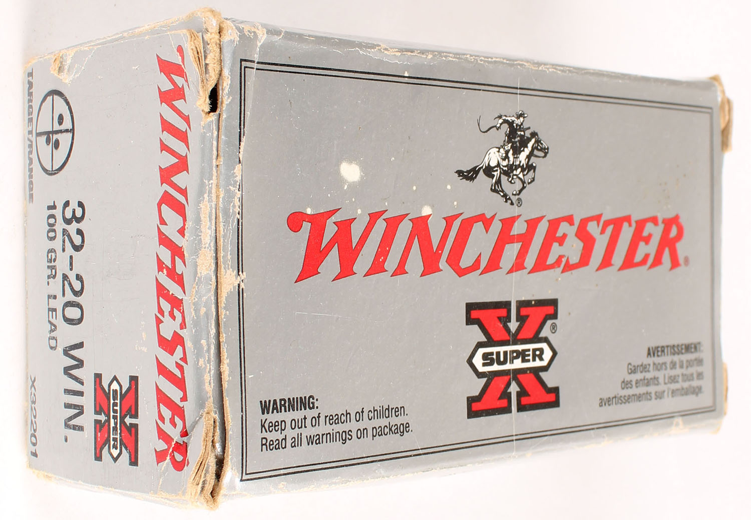 Winchester, Super-X, .32-20 Winchester, 100 Gr. Lead, Full, 1pc. Silver & red box, box is solid with minty color, shelf wear, edge & corner wear, ammo is very good to excellent. Grade: Very Good + - Value: 40 to 120