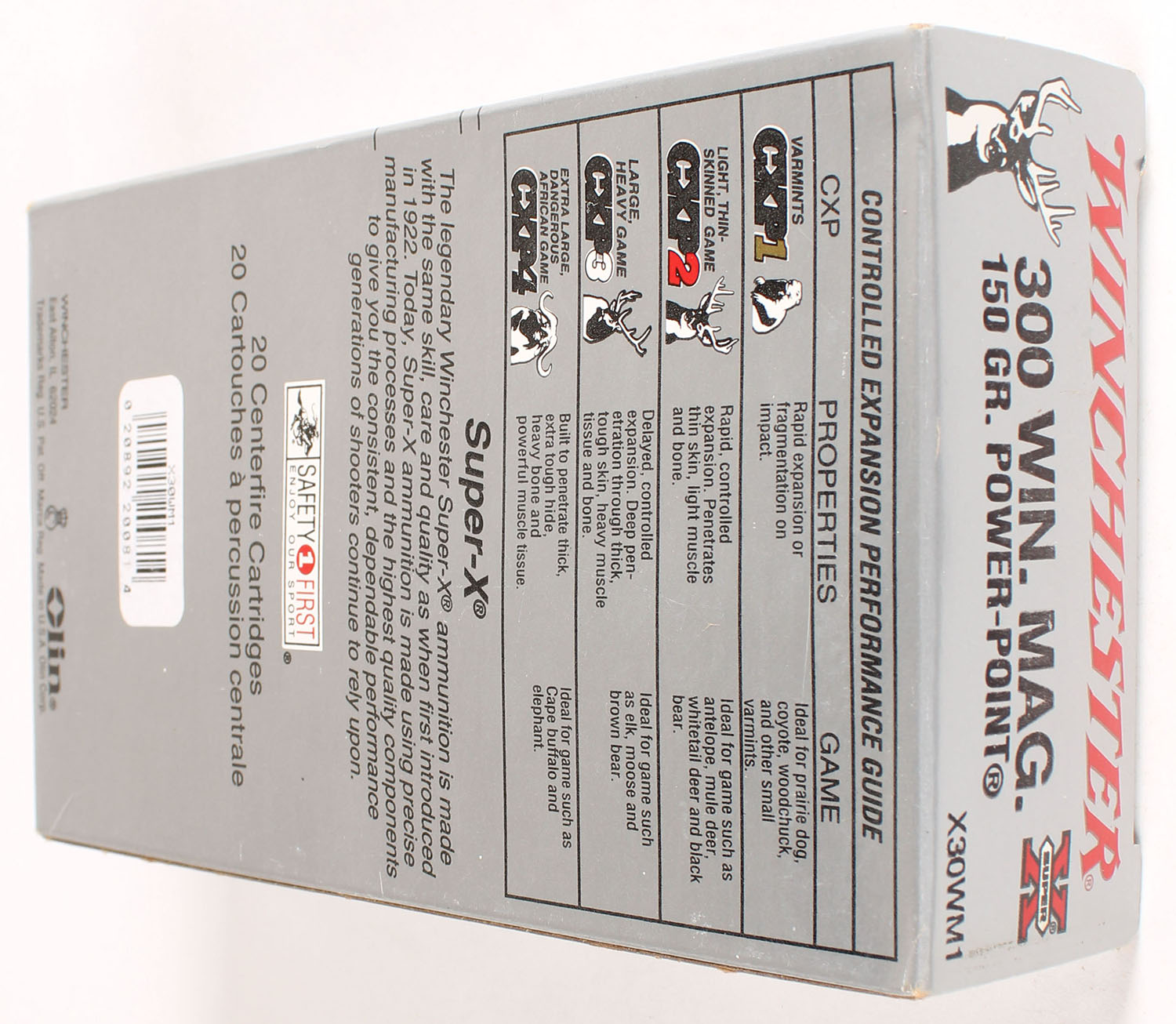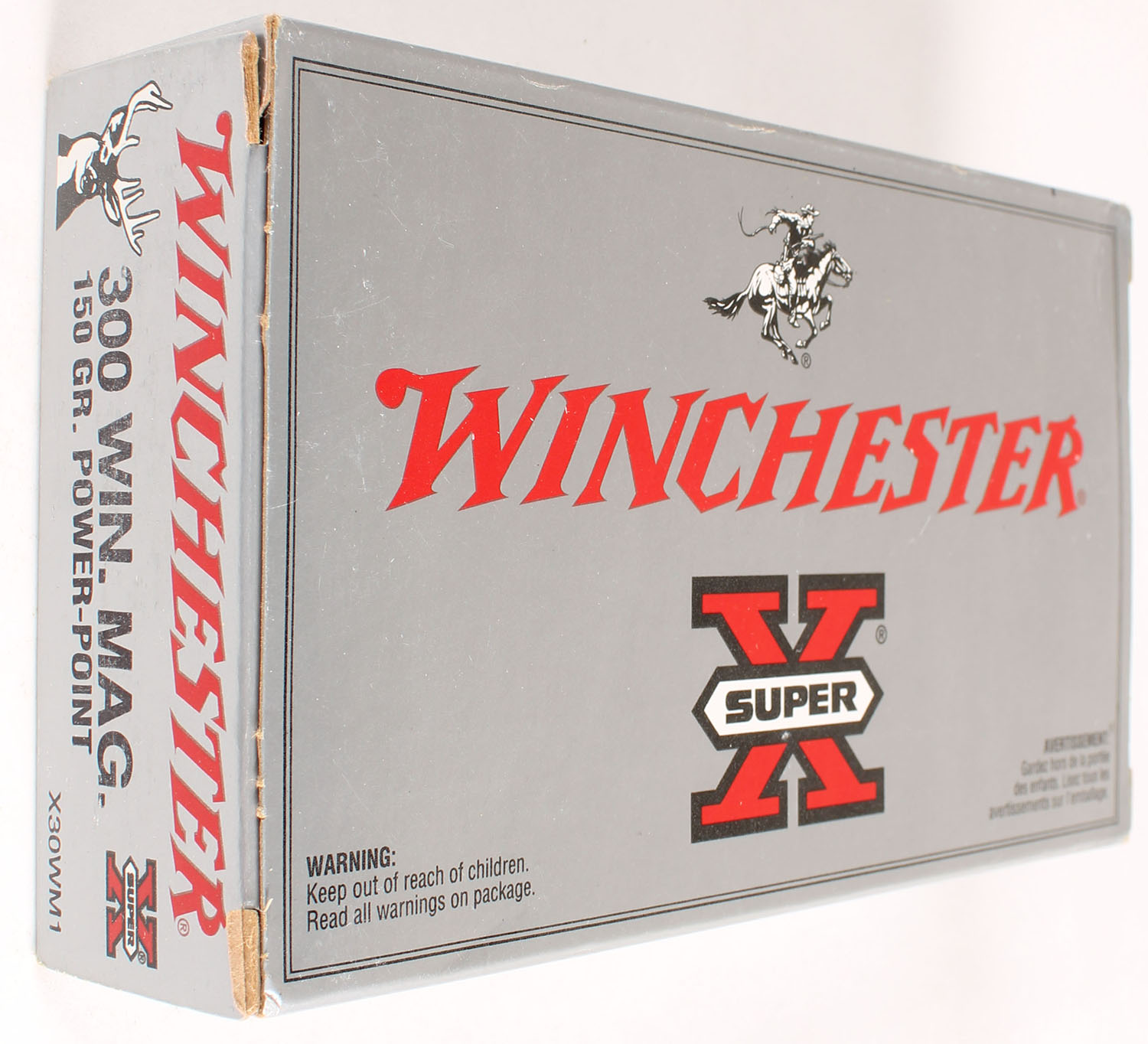 Winchester, Super-X, 300 Winchester Magnum, 150 Gr. Power-Point, Full, 1pc. Silver & red box, box is near mint with minty color, only very minor corner wear, ammo is excellent. Grade: Excellent ++ - Value: 16 to 60
