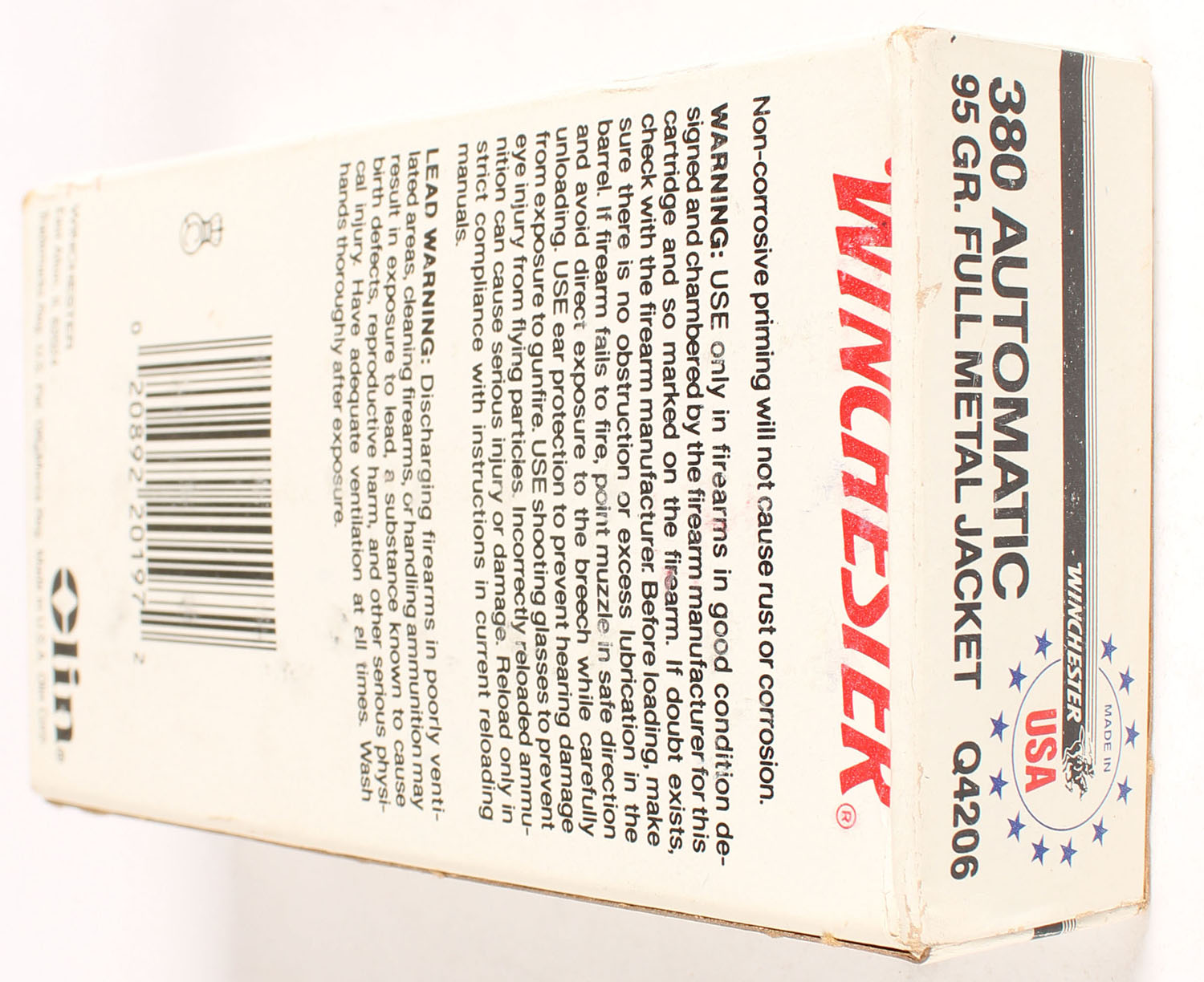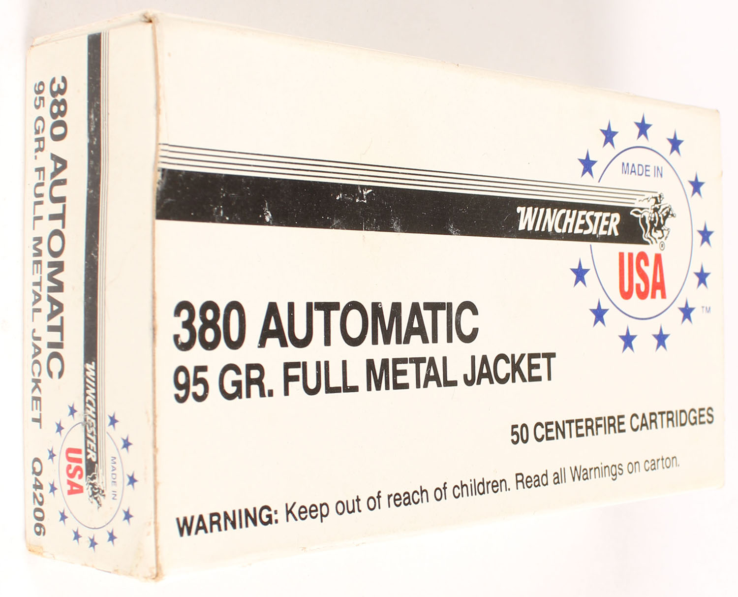Winchester, Centerfire Cartridges, .380 Automatic, 95 Gr. Full Metal Jacket, Full, 1pc. White & black box, box is solid with excellent color, some corner wear, ammo is excellent. Grade: Excellent - Value: 10 to 40
