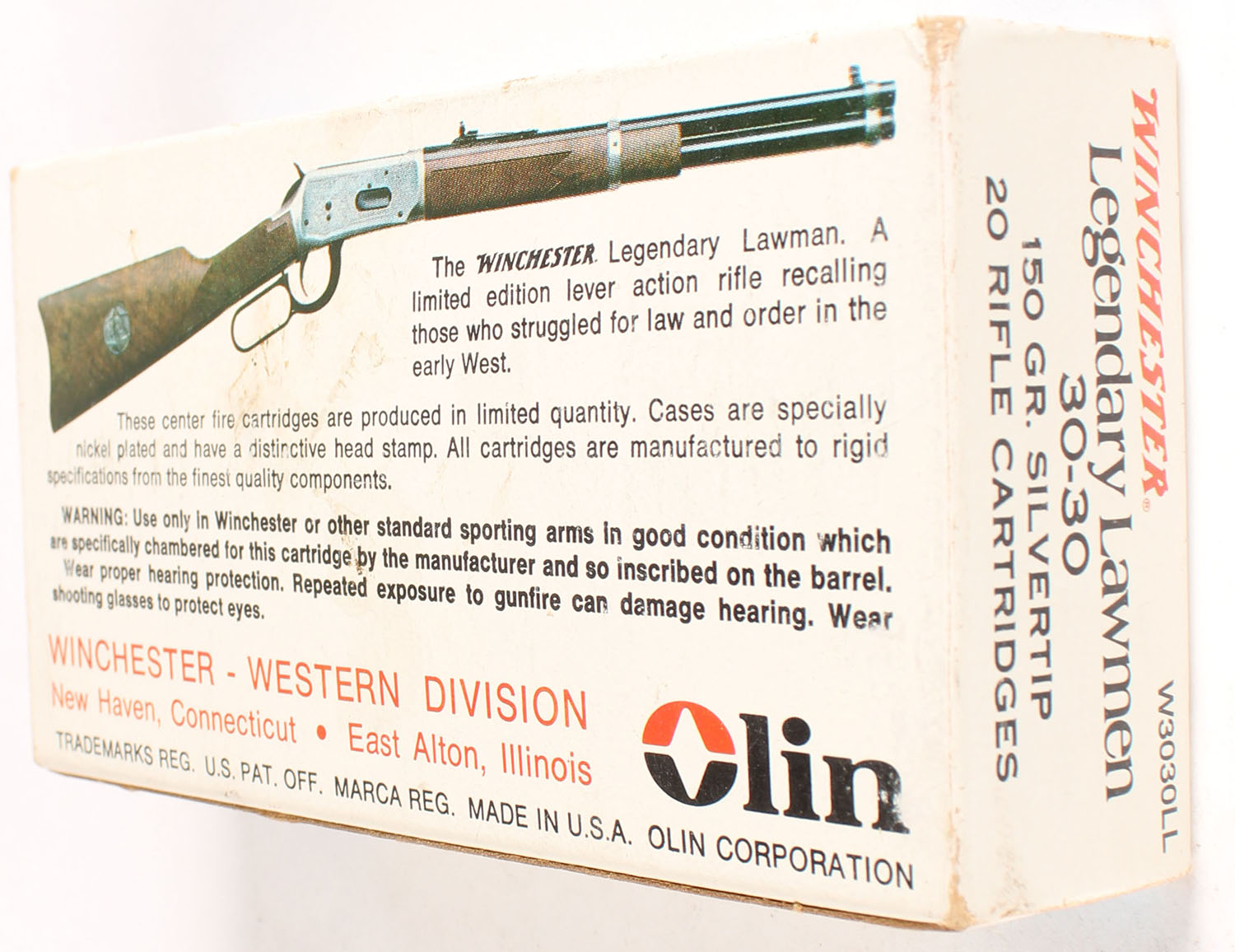 Winchester, Legendary Lawman, .30-30 Winchester, 150 Gr. Silvertip, Full, 1pc. Multi-colored box, box is solid with excellent color, very minor age soiling, very minor edge & corner wear, Coast to Coast sticker on top, end flaps are solid, ammo is minty. Grade: Excellent - Value: 40 to 120
