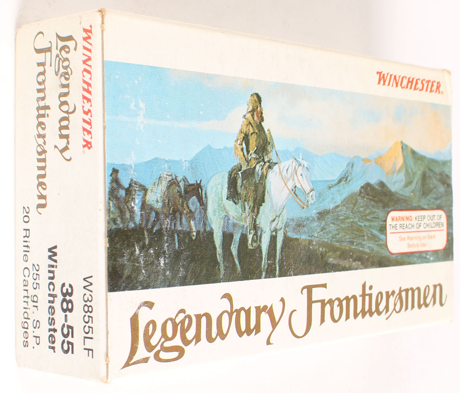 Winchester, Legendary Frontiersmen, .38-55 Winchester, 255 Grain Soft Point, Full, 1pc. Multi-colored box, box is solid with excellent color, very minor shelf & corner wear, edges are crisp, end flaps are solid, ammo is excellent to minty. Grade: Excellent + - Value: 40 to 120