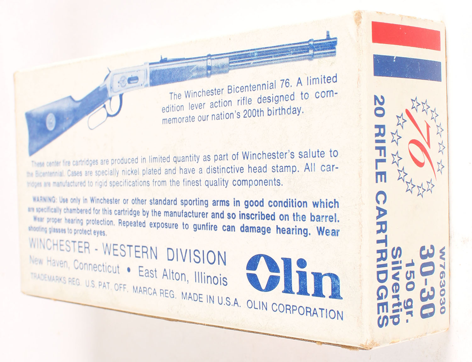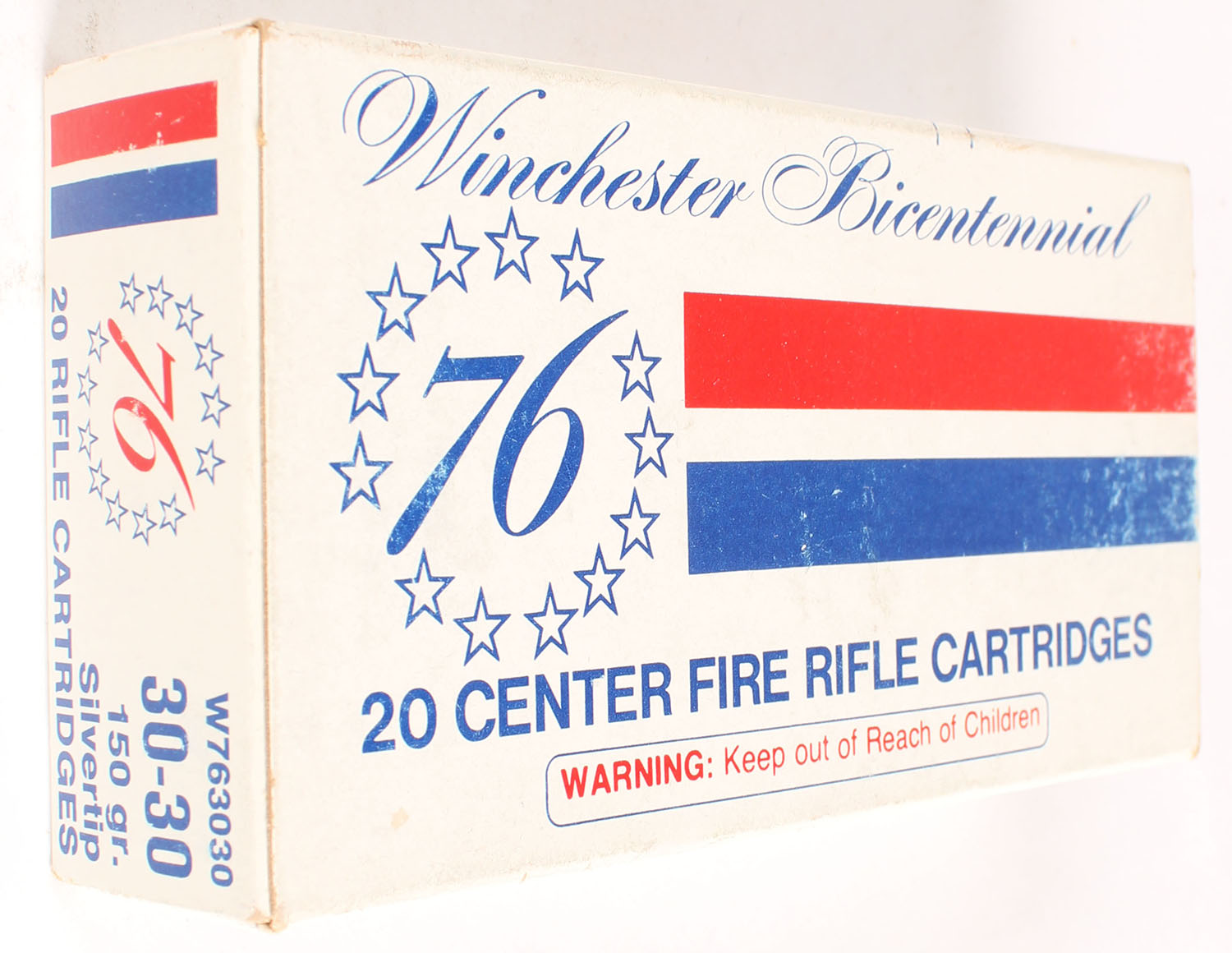 Winchester, Bicentennial, .30-30 Winchester, 150 Gr. Silvertip, Full, 1pc. White blue & red box, box is solid with excellent color, minor shelf wear, very minor corner wear, edges are crisp, end flaps are solid, ammo is minty. Grade: Excellent - Value: 10 to 50