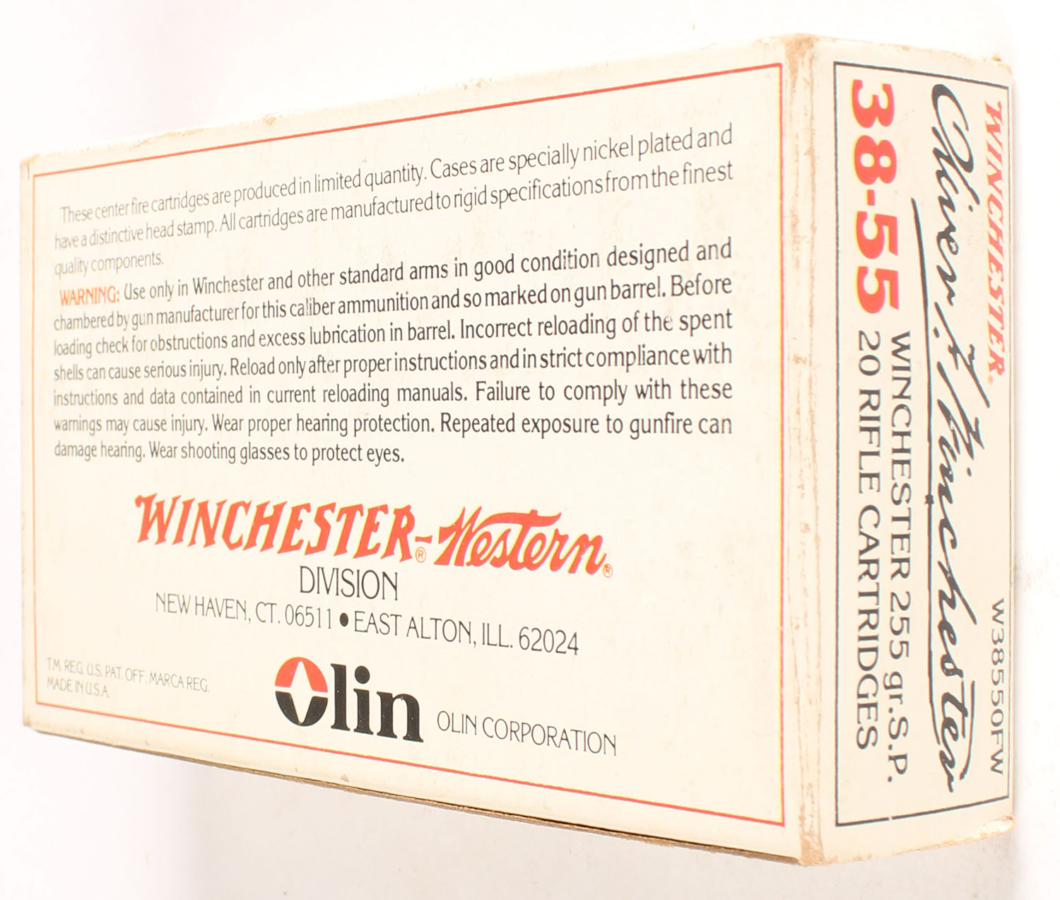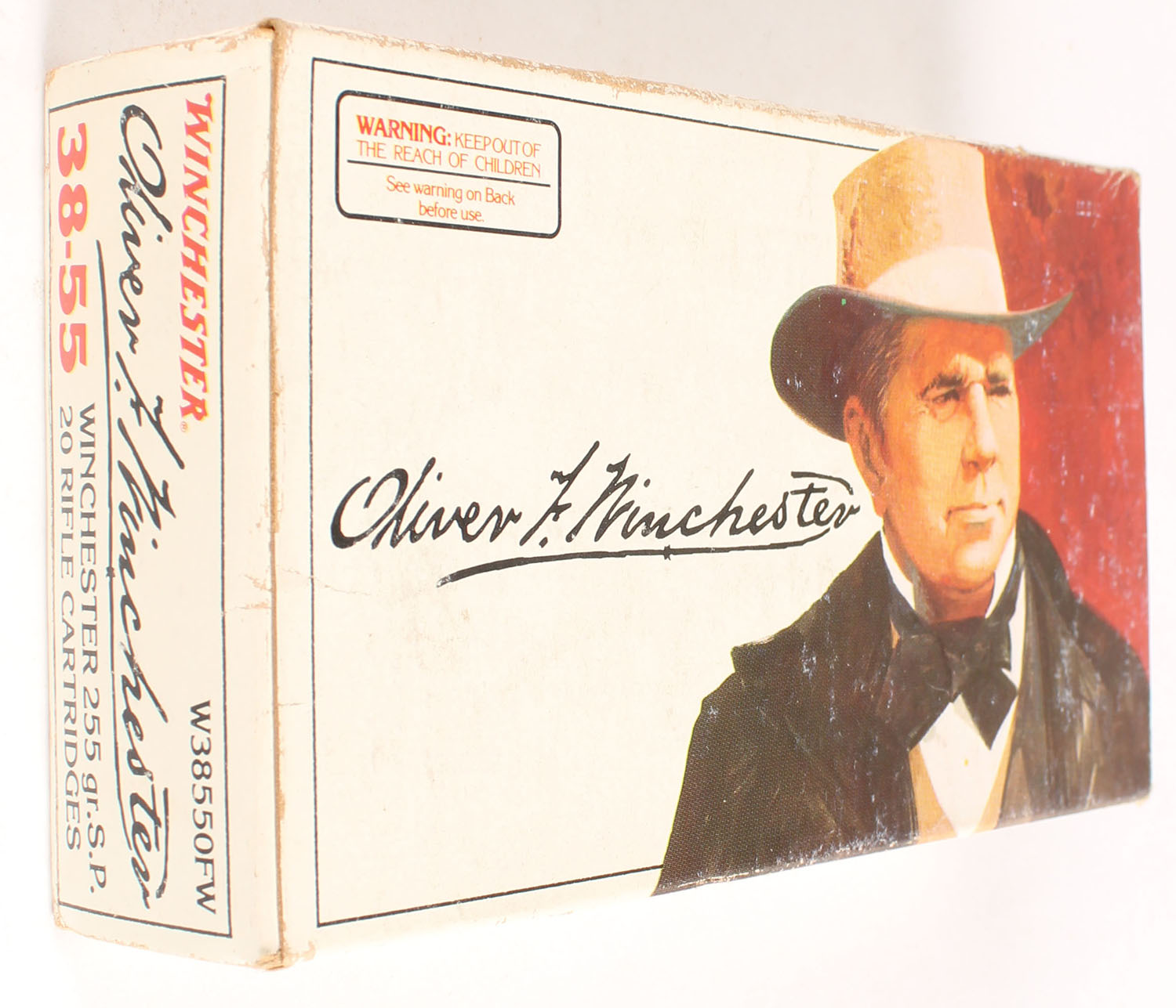 Winchester, Oliver F. Winchester, .38-55 Winchester, 255 Grain Soft Point, Full, 1pc. White box picturing Oliver Winchester, box is solid with very good to excellent color, minor age soiling & shelf wear, very minor edge & corner wear, end flaps are solid, ammo is excellent. Grade: Excellent - Value: 30 to 90