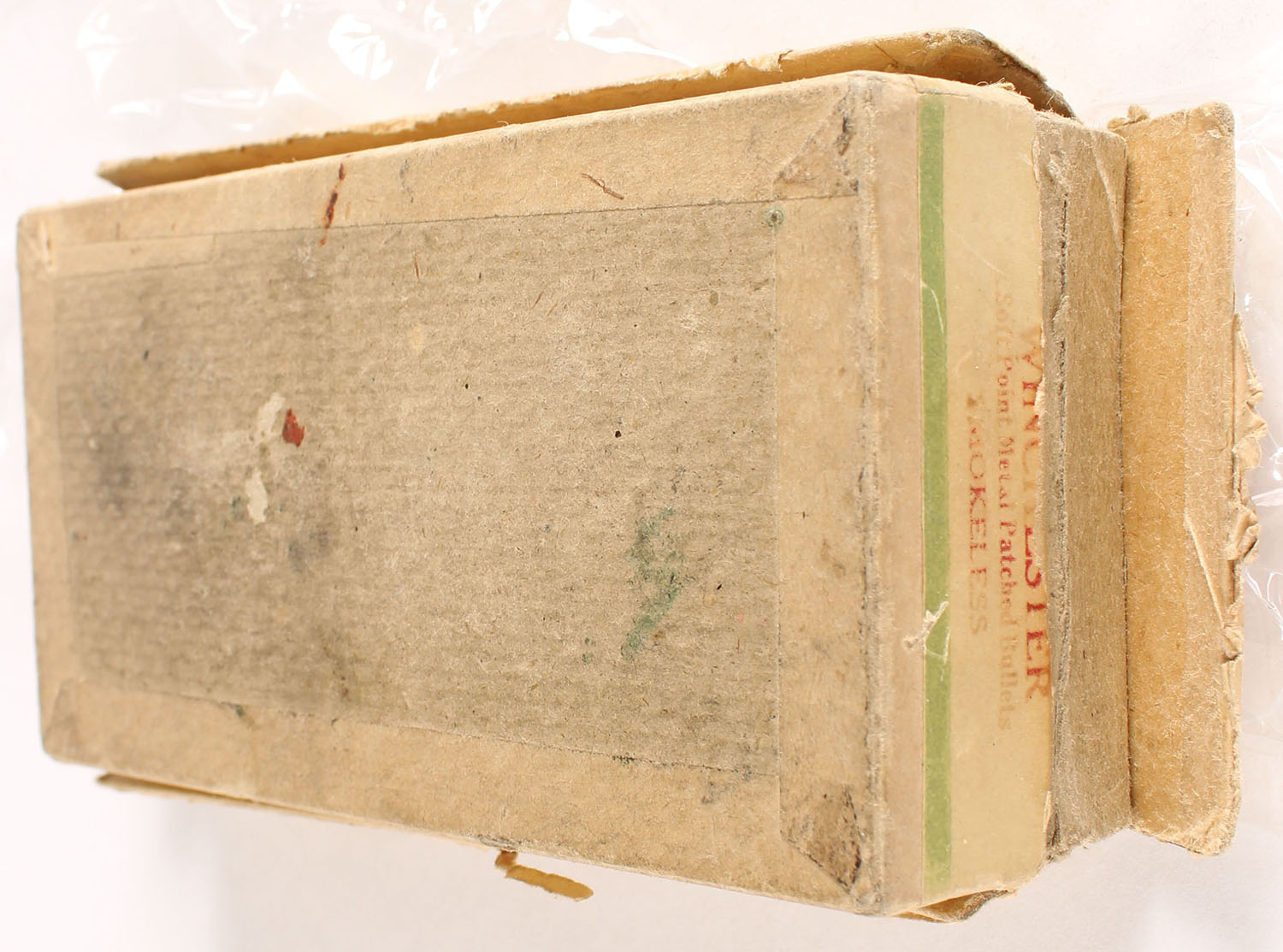 Western, Central Fire Cartridges, .38-40 Winchester, Smokeless, Partial 18rds. of incorrect ammo, 2pc. White green & red box, vertical seam splits to all corners of lid, vertical seam splits to both left end corners of bottom, good to very good color, age soiling, some edge & corner wear, ammo is very good. Grade: Poor ++ - Value: 14 to 40