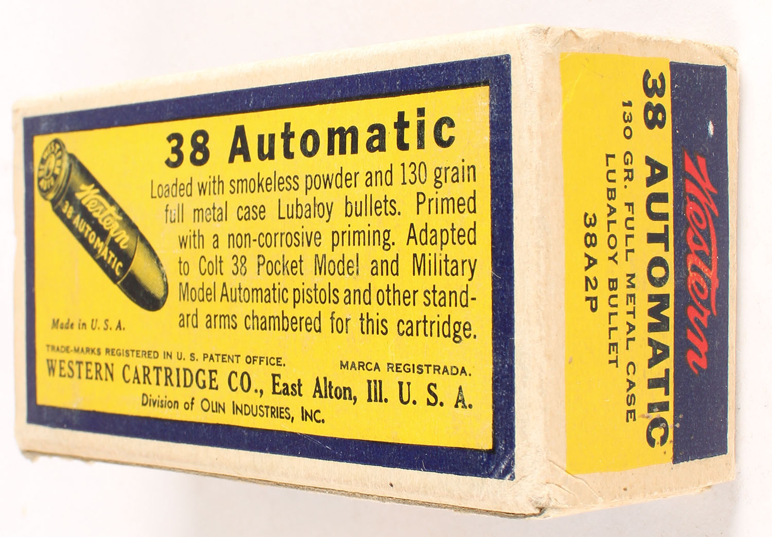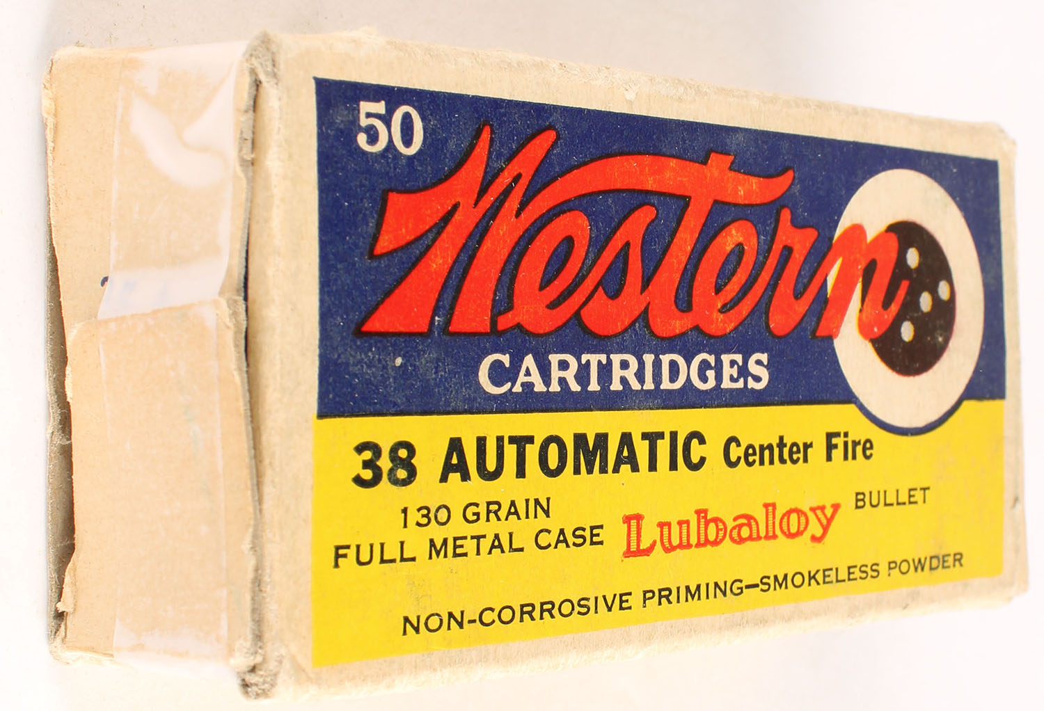 Western, Center Fire Cartridges, .38 Automatic, 130 Grain Full Metal Case Lubaloy Coated Bullet, Full, 1pc. Blue yellow & red bull's eye box, missing left end flap, excellent color, very minor age soiling, some edge & corner wear, right end flap is solid, ammo is excellent. Grade: Very Good - Value: 10 to 40
