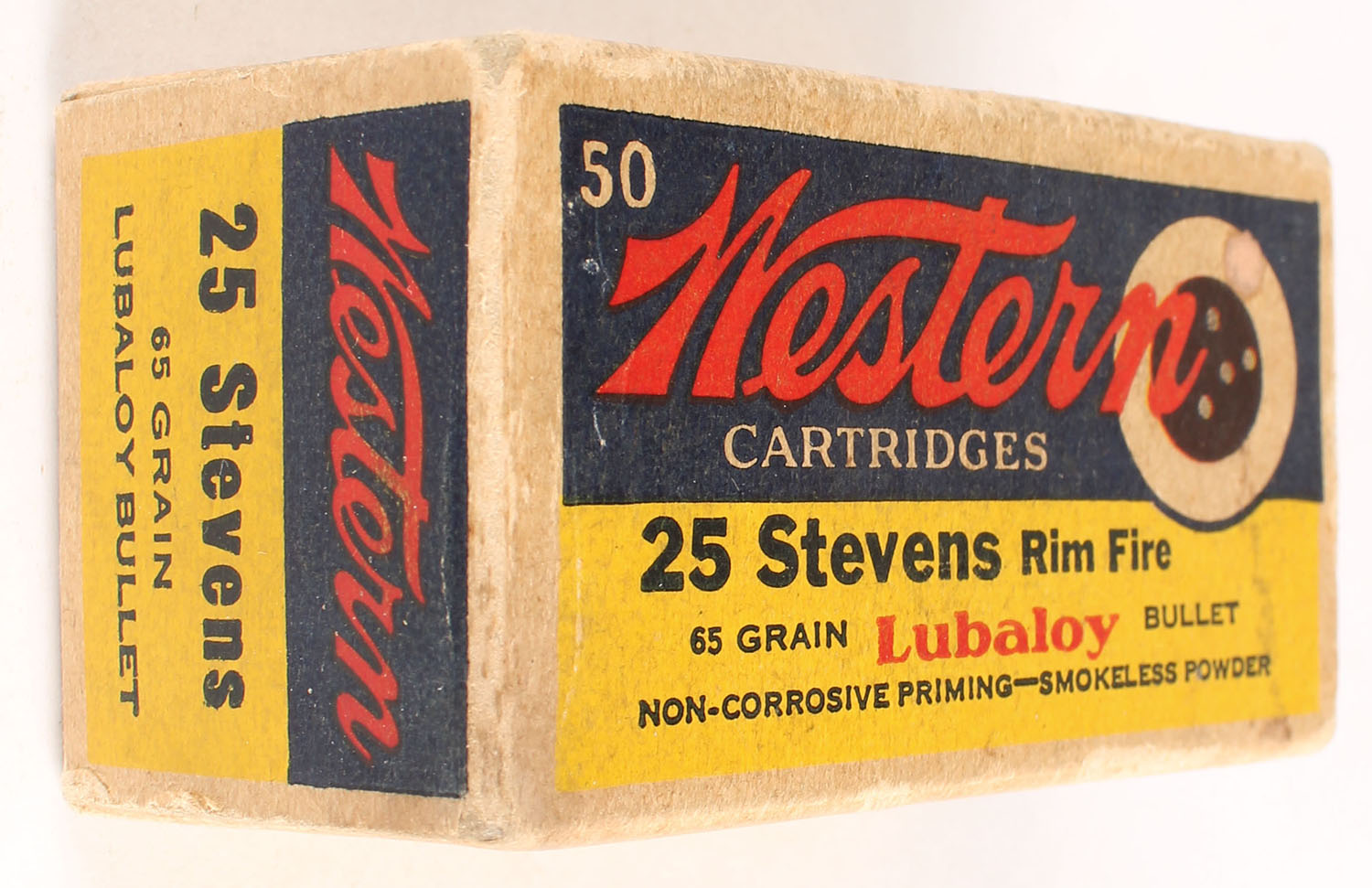 Western, Rim Fire Cartridges, .25 Stevens, 65 Grain Lubaloy Bullet, Smokeless Powder, Partial 25rds. 1pc. Blue yellow & red bull's eye box, box is solid with very good to excellent color, some age soiling, very minor edge & corner wear, front has been written on, end flaps are solid, ammo is excellent. Grade: Very Good ++ - Value: 30 to 90