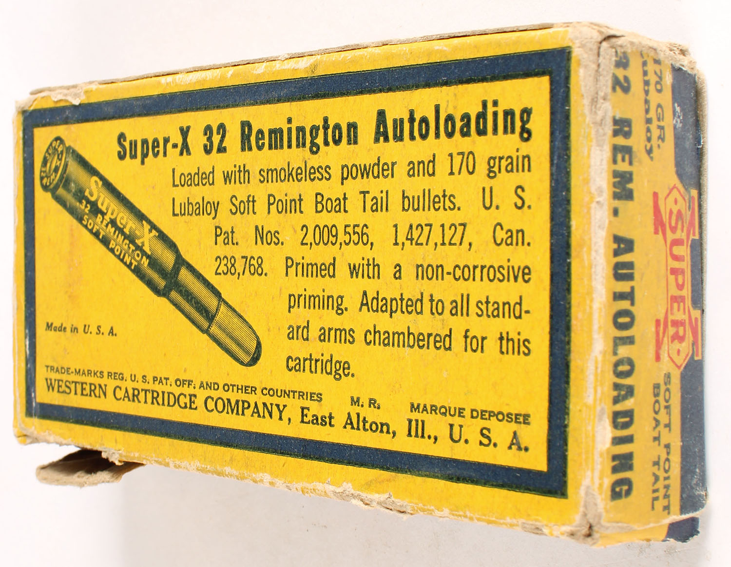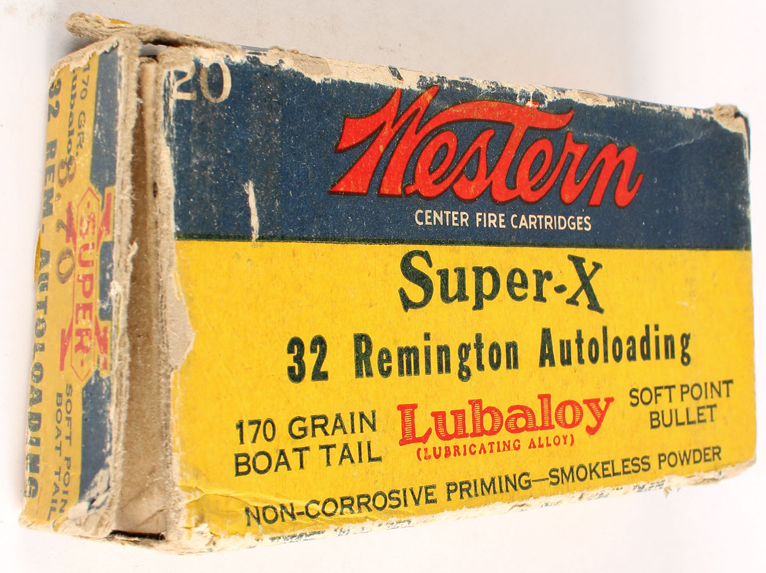Western, Super-X, .32 Remington Autoloading, 170 Soft Point Boat Tail Lubaloy Bullet, Partial 19rds. 1pc. Yellow blue & red box, left end flap is torn, very good color, age soiling, edge & corner wear, partial seam split to top front edge, right end flap is solid, ammo is excellent. Grade: Good + - Value: 10 to 40