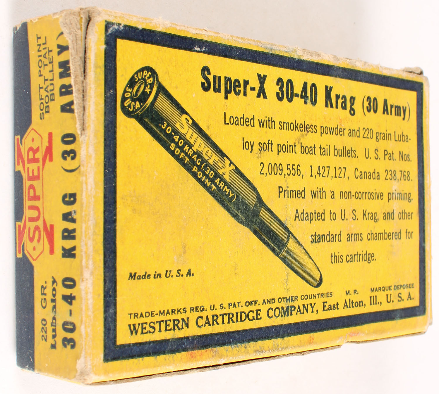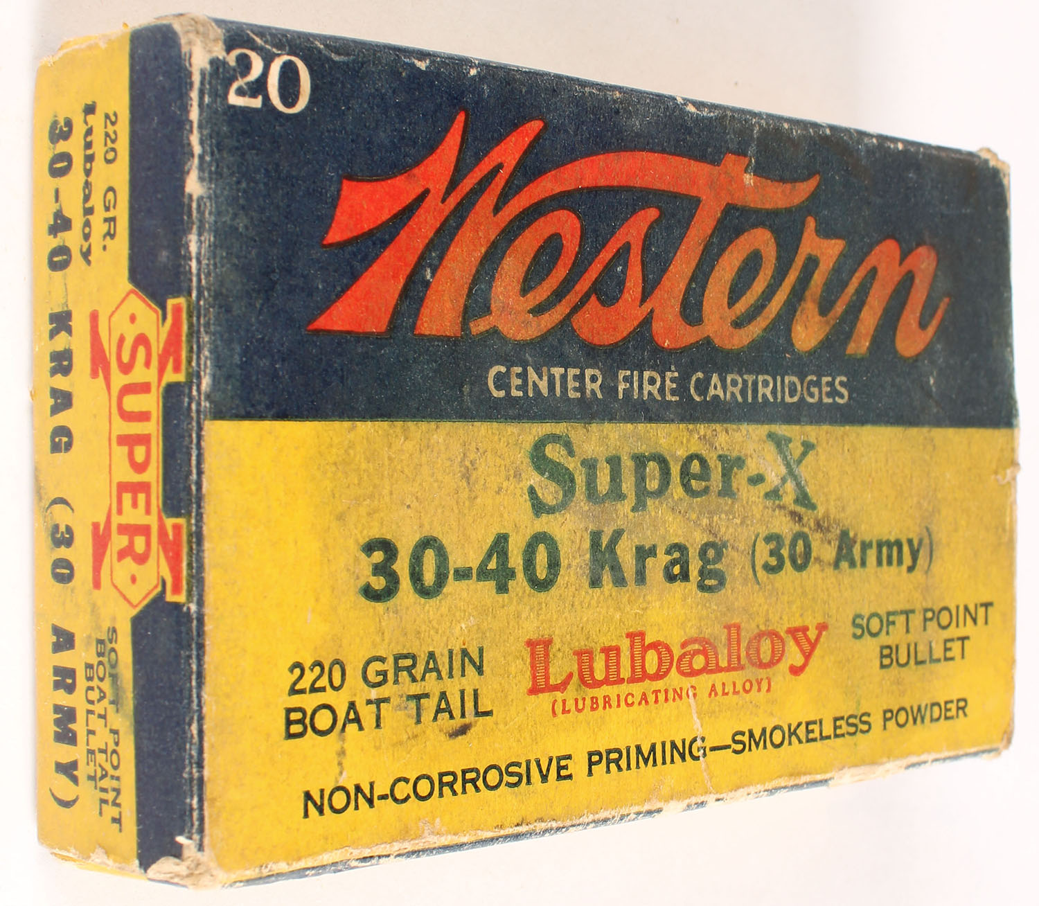 Western, Super-X, .30-40 Krag (.30 Army), 220 Grain Boat Tail Soft Point Lubaloy Bullet, Full, 1pc. Yellow blue & red box, box is solid with fair to good color, age soiling, some edge & corner wear, end flaps are solid, ammo is good. Grade: Good ++ - Value: 10 to 40