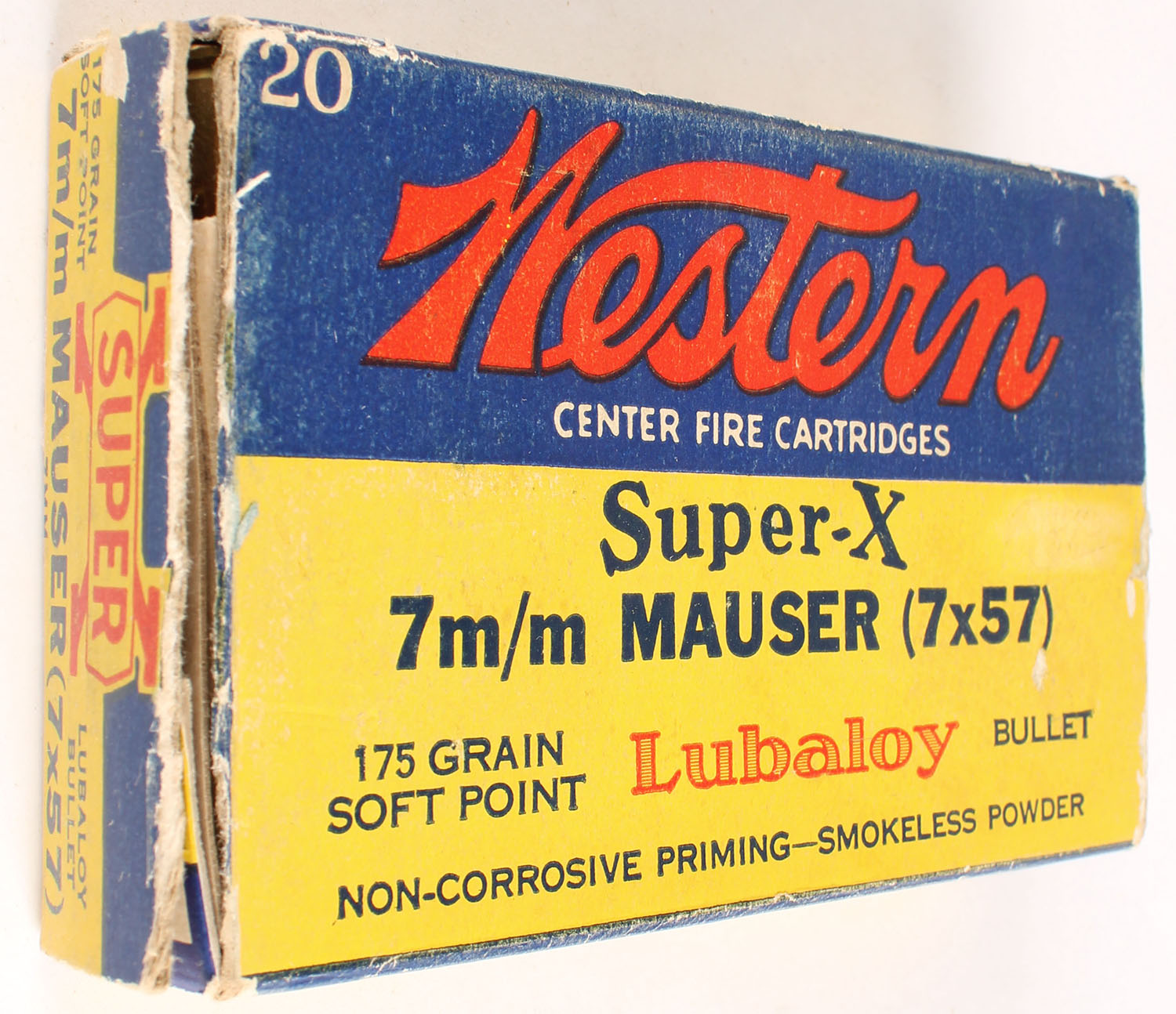 Western, Super-X, 7mm Mauser (7x57), 175 Grain Soft Point Lubaloy Bullet, Full, 1pc. Yellow blue & red box, left end flap is torn, excellent color, very minor age soiling & shelf wear, some edge & corner wear, right end flap is solid, ammo is excellent. Grade: Very Good + - Value: 16 to 60