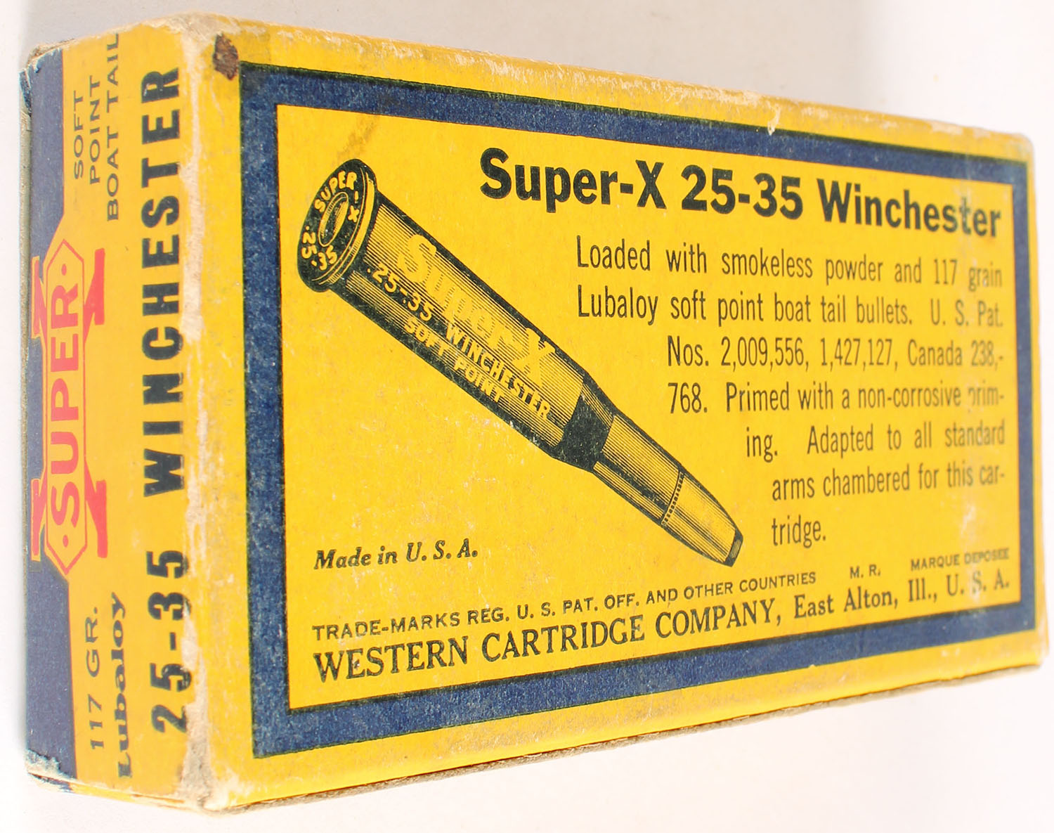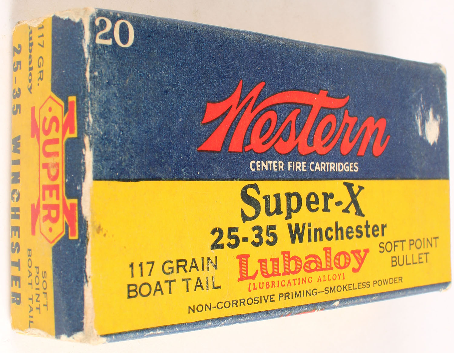 Western, Super-X, .25-35 Winchester, 117 Grain Boat Tail Soft Point Lubaloy Bullet, Full, 1pc. Yellow blue & red box, box is solid with excellent color, very minor age soiling & shelf wear, some corner wear, edges are mostly crisp, end flaps are solid, ammo is excellent. Grade: Excellent - Value: 40 to 120