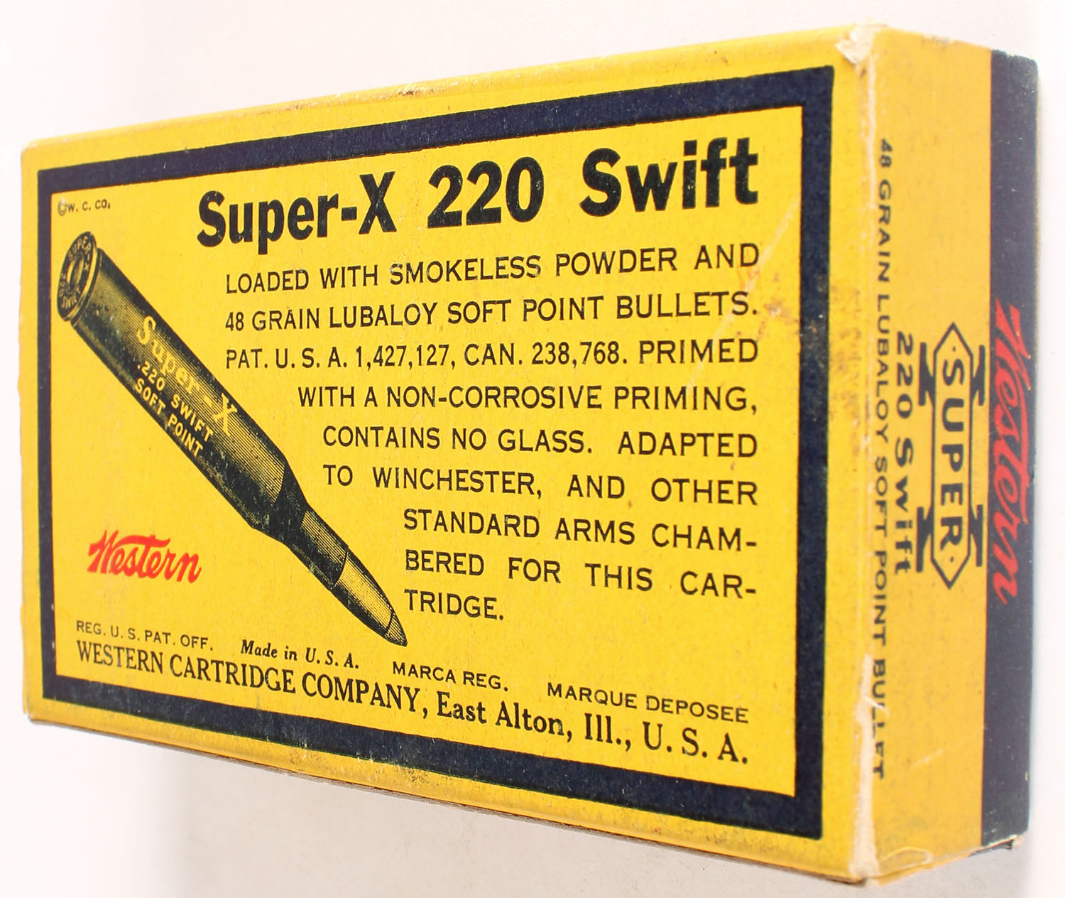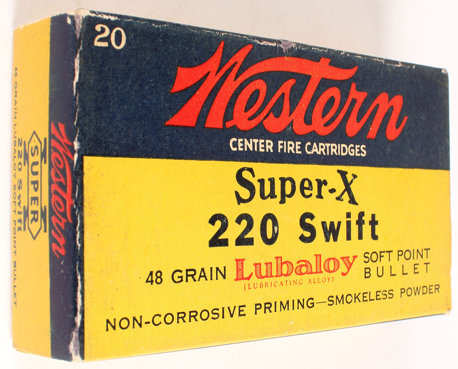 Western, Super-X, .220 Swift, 48 Grain Soft Point Lubaloy Bullet, Full, 1pc. Yellow blue & red box, box is solid with excellent color, minor age soiling, minor edge & corner wear, end flaps are solid, ammo is very good. Grade: Excellent - Value: 20 to 80
