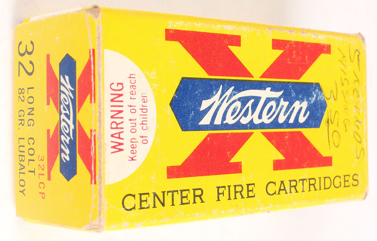 Western, X, .32 Long Colt, 82 Grain Lubaloy Bullet, Full, 1pc. Yellow white & red box, box is solid with excellent color, very minor shelf wear, top has been written on, minor edge & corner wear, end flaps are solid, ammo is excellent. Grade: Very Good ++ - Value: 30 to 90