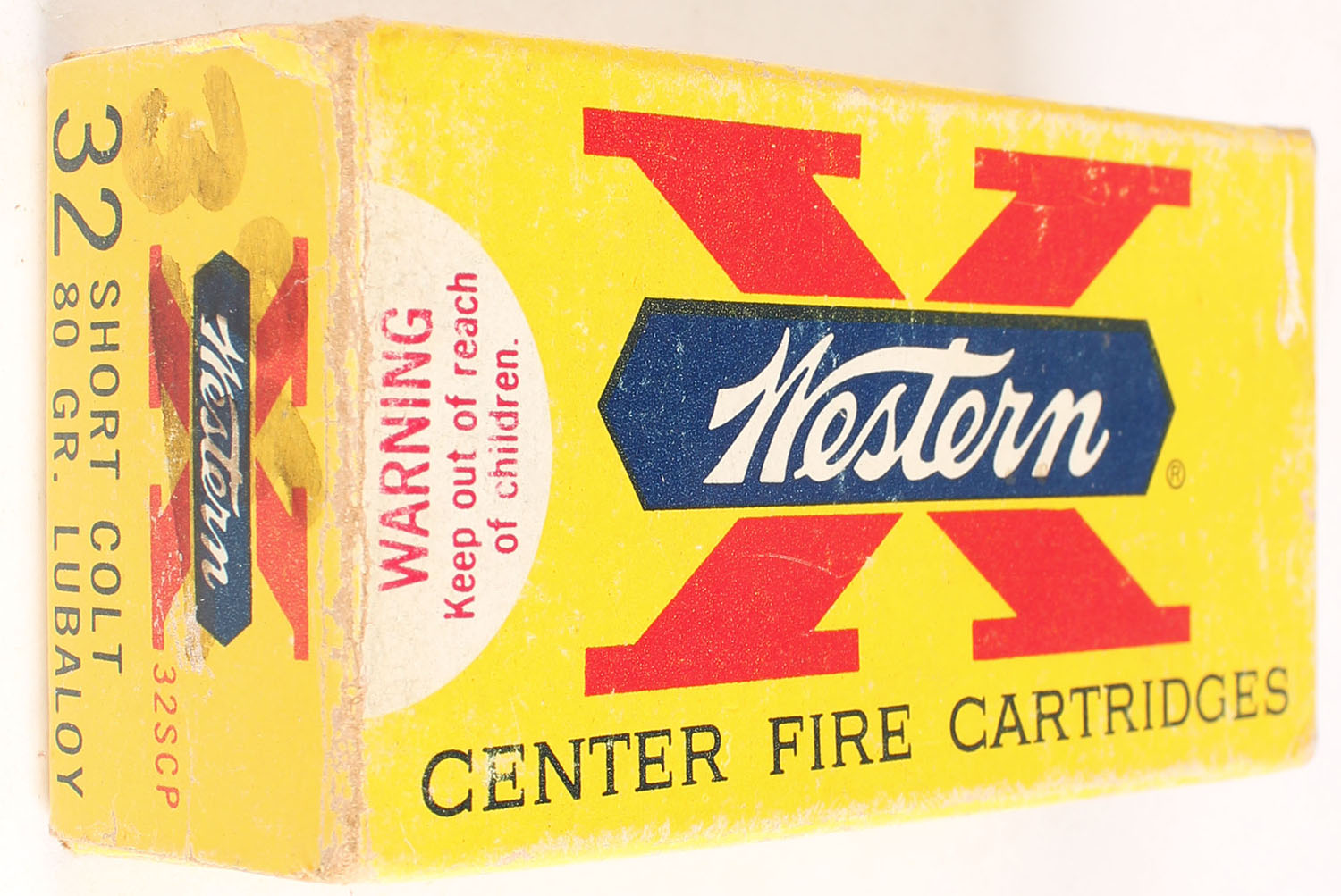 Western, X, .32 Short Colt, 80 Gr. Lubaloy Bullet, Full, 1pc. Yellow white & red box, box is solid with excellent color, very minor shelf & edge wear, minor corner wear, end flaps are solid, ammo is excellent. Grade: Excellent - Value: 40 to 120