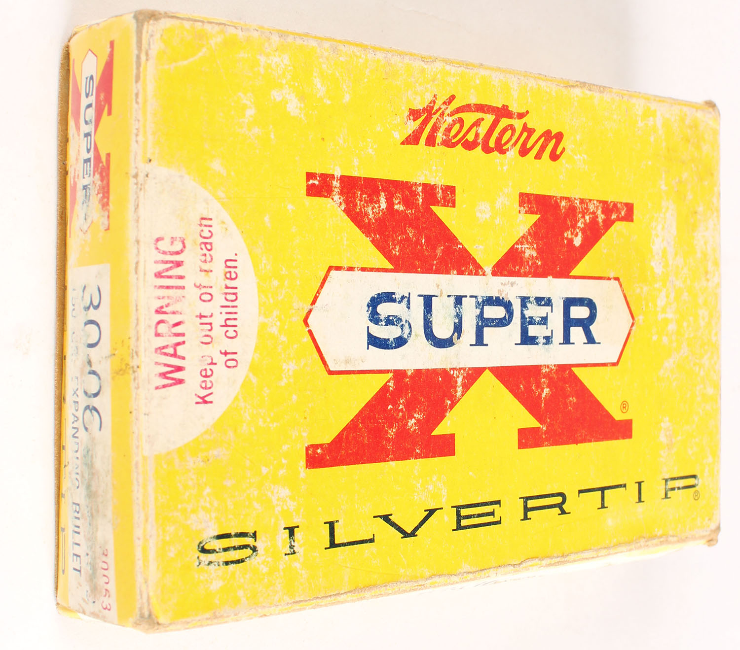 Western, Super-X Silvertip, .30-06 Springfield, 150 Grain Expanding Bullet, Full, 1pc. Yellow white & red box, box is solid with good to very good color, minor age soiling, shelf wear, edge & corner wear, end flaps are solid, ammo is excellent. Grade: Very Good - Value: 16 to 60
