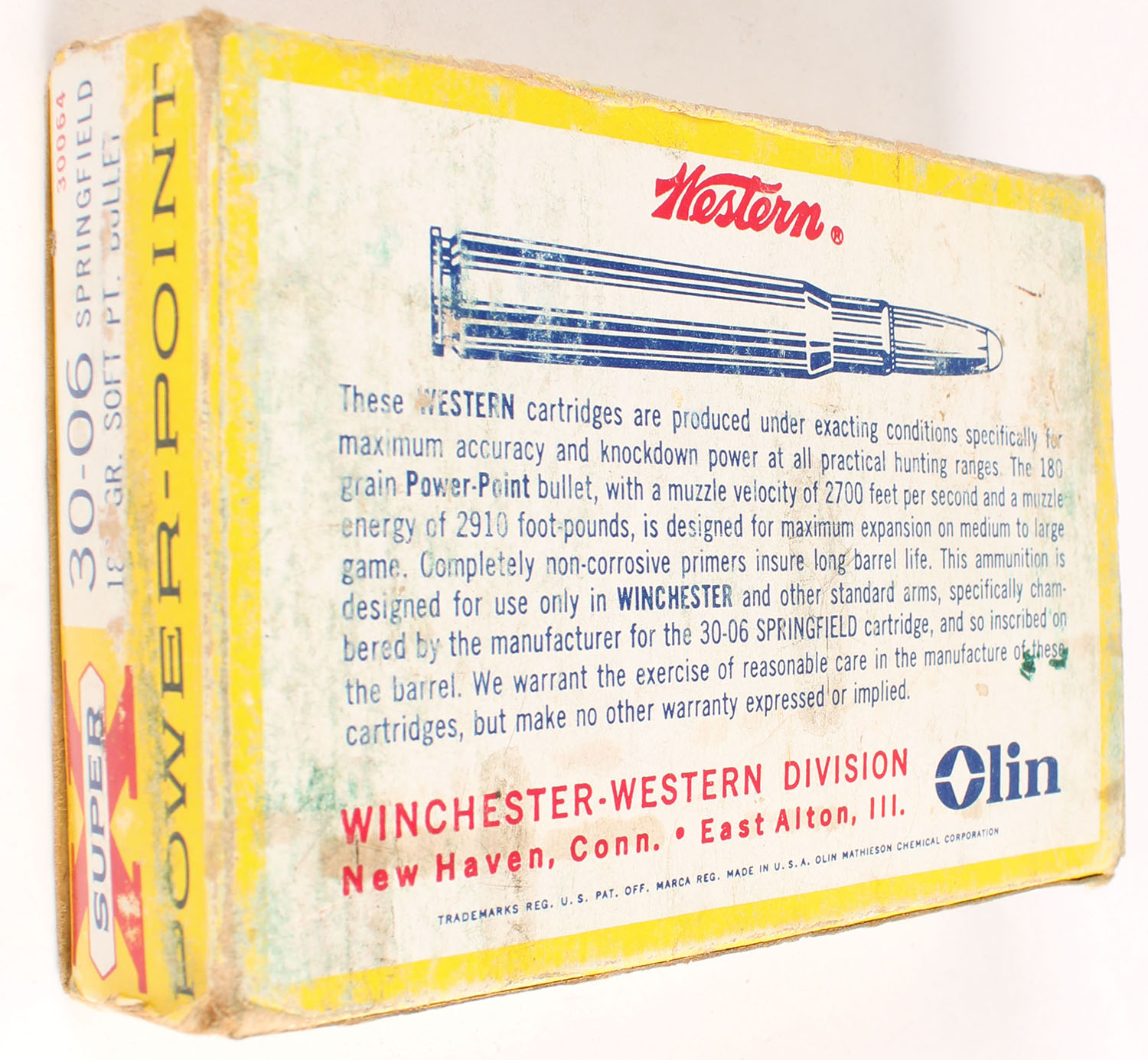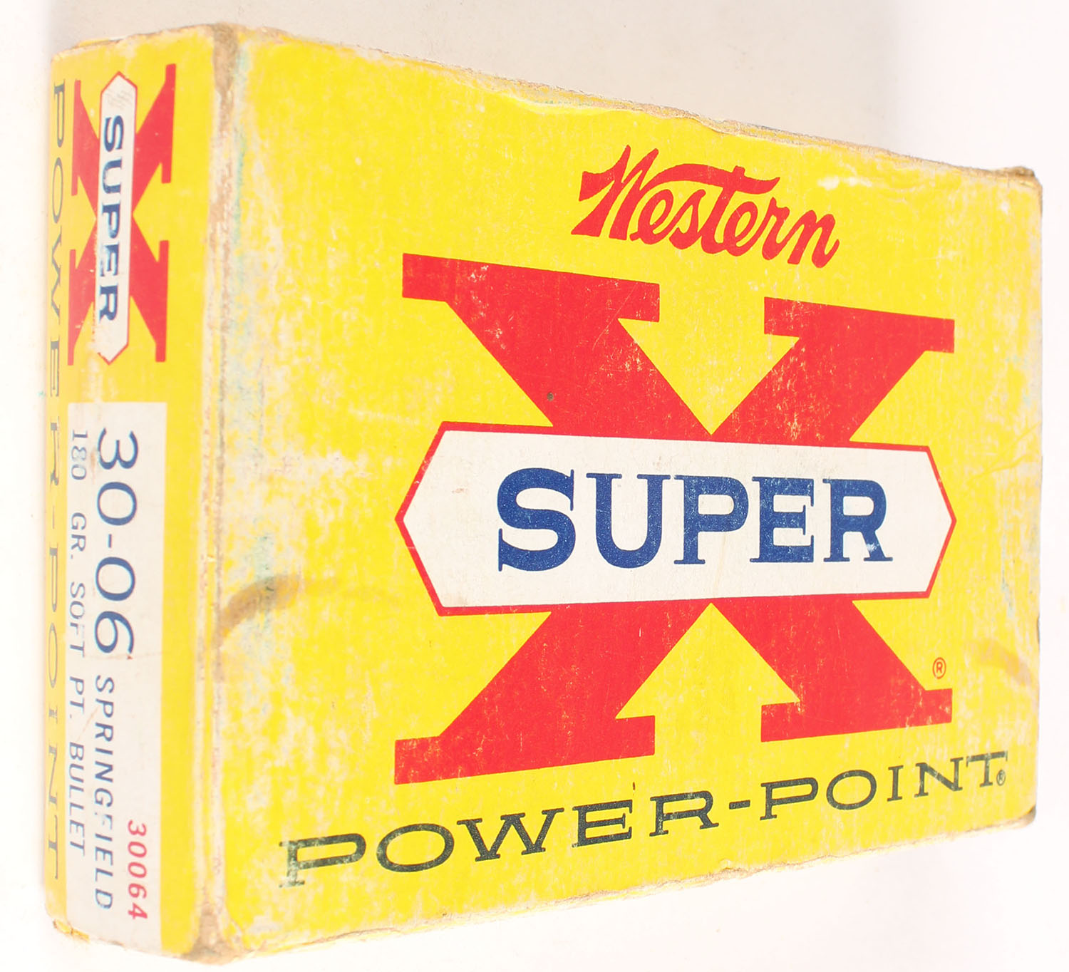 Western, Super-X Power-Point, .30-06 Springfield, 180 Grain Soft Point Bullet, Partial 16rds. correct, 1pc. Yellow white & red box, box is solid with very good color, shelf wear, some edge & corner wear, end flaps are solid, ammo is excellent. Grade: Very Good + - Value: 8 to 40