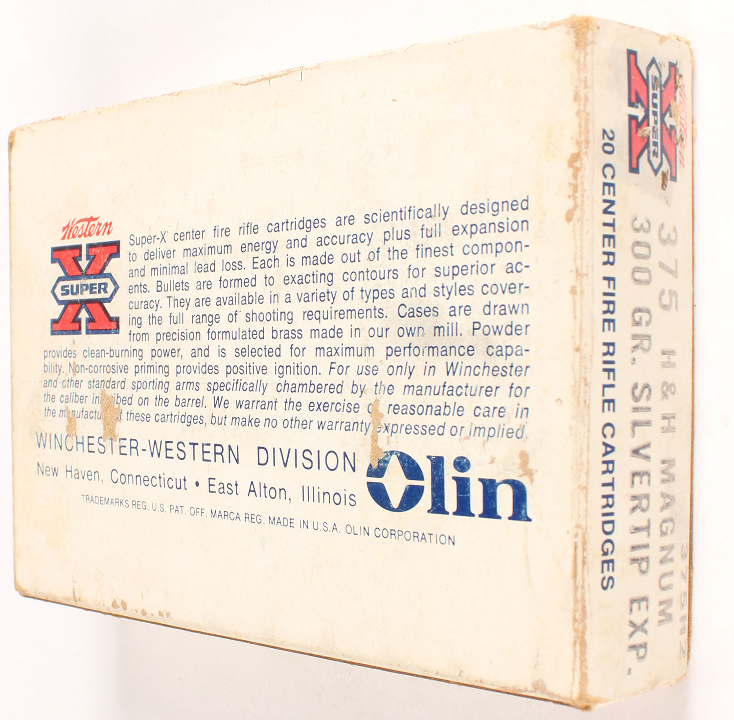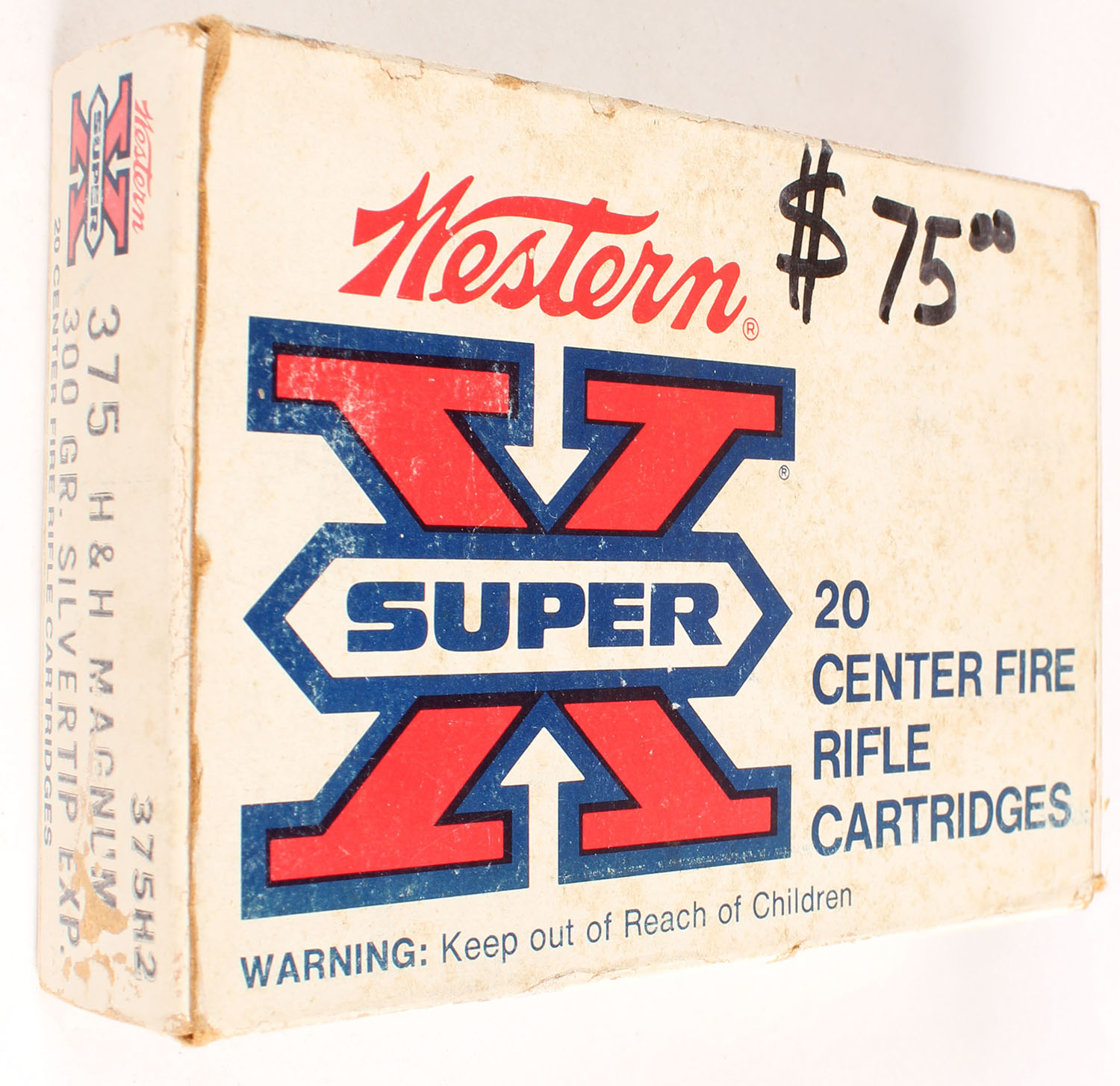 Western, Super-X, .375 Holland & Holland Magnum, 300 Grain Silvertip Expanding, Full, 1pc. White red & blue box, box is solid with very good color, age soiling, some edge & corner wear, top has been written on, end flaps are solid, ammo is excellent. Grade: Very Good ++ - Value: 30 to 90