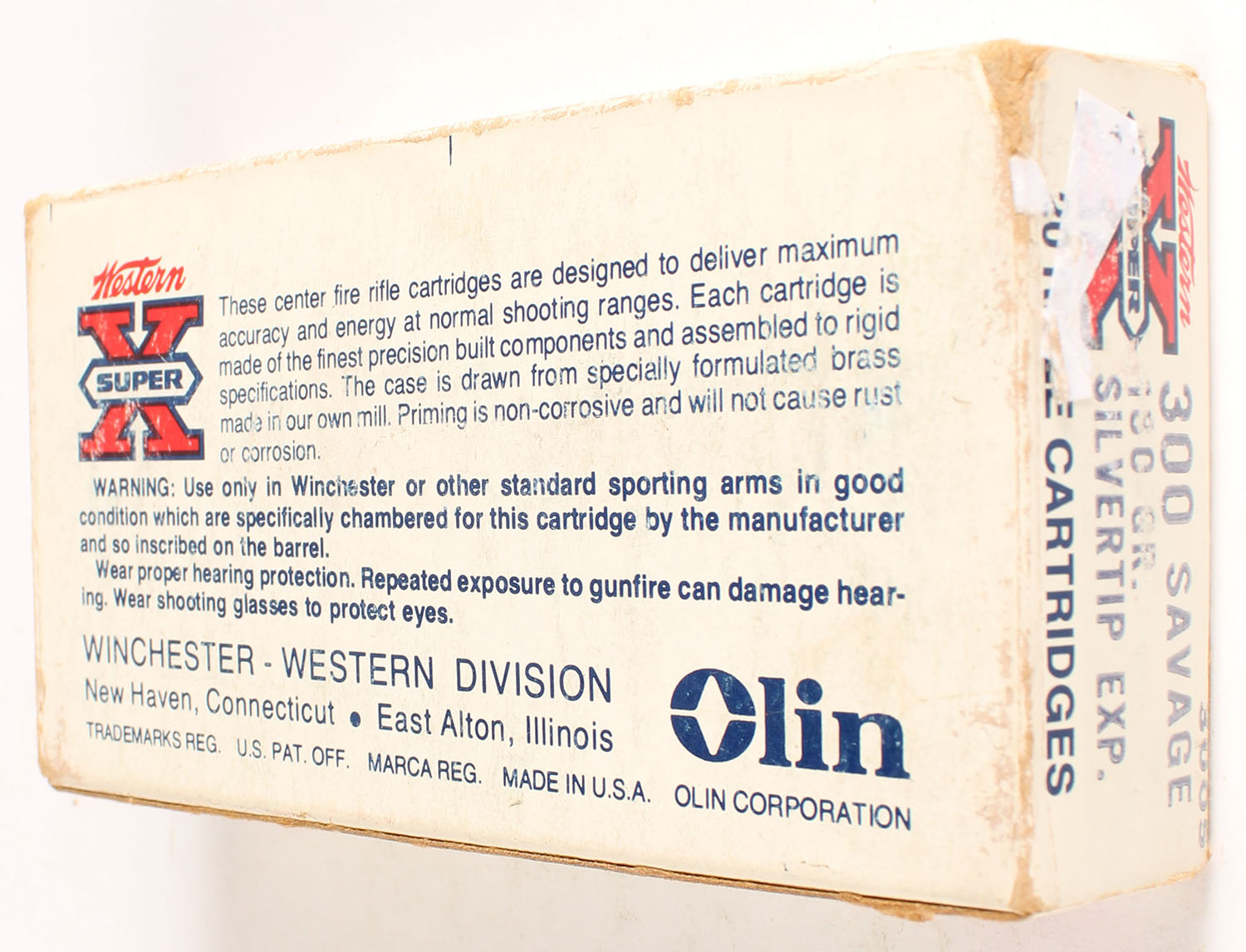 Western, Super-X, .300 Savage, 180 Grain Silvertip Expanding, Full, 1pc. White red & blue box, box is solid with very good color, some age soiling & shelf wear, some edge & corner wear, end flaps are solid, ammo is excellent to minty. Grade: Very Good ++ - Value: 20 to 60