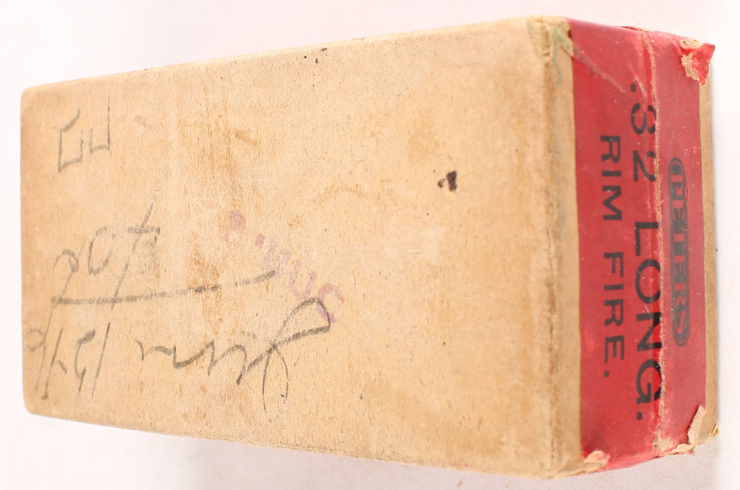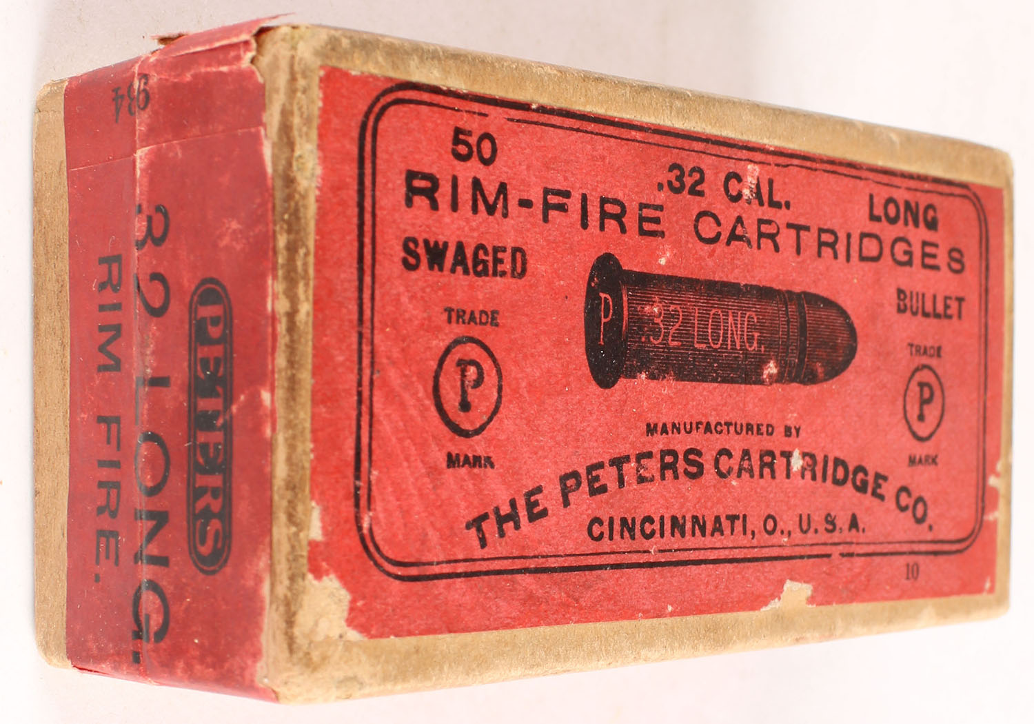 Peters, Rim-Fire Cartridges, .32 Long Rim-Fire, Swaged Bullet, FULL & SEALED, 2pc. Buff box with red top & side sealing labels, box is solid with very good to excellent color, minor age soiling, some corner wear, edges are mostly crisp, labels are intact. Grade: Excellent + - Value: 70 to 210