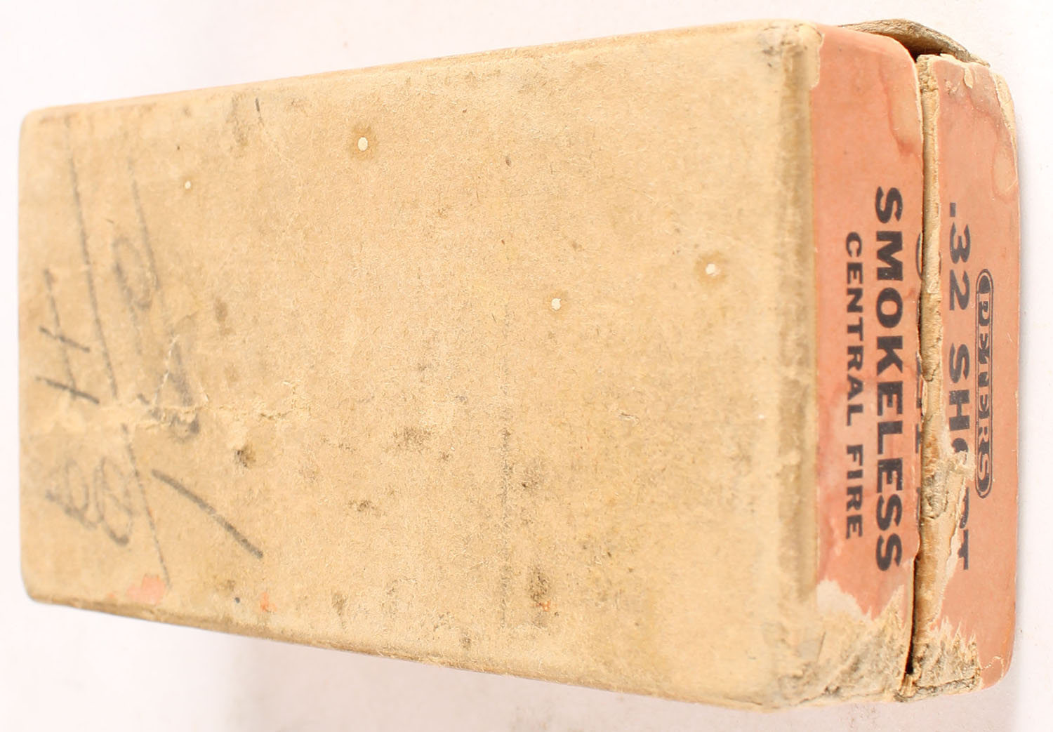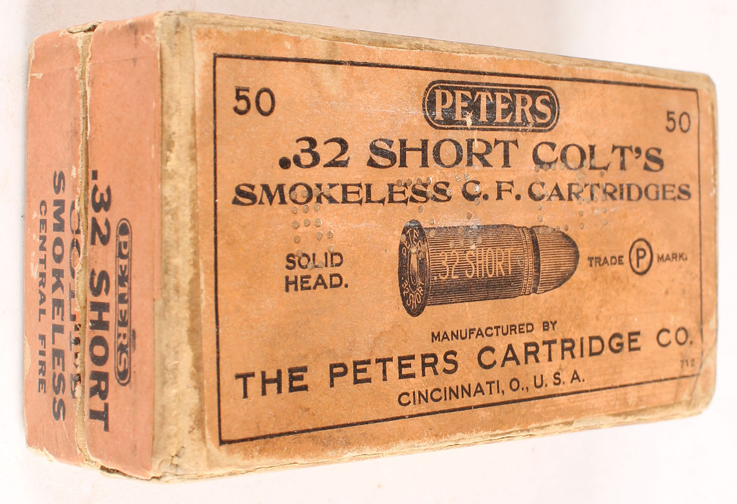 Peters, Smokeless C.F. Cartridges, .32 Short Colt, Full, 2pc. Buff box with orange top & side sealing labels, box is solid with very good color, some age soiling & staining, scuff on front, vertical seam splits to front corners of lid, edge & corner wear, side sealing label is 99% intact, ammo is good to very good. Grade: Very Good + - Value: 30 to 90