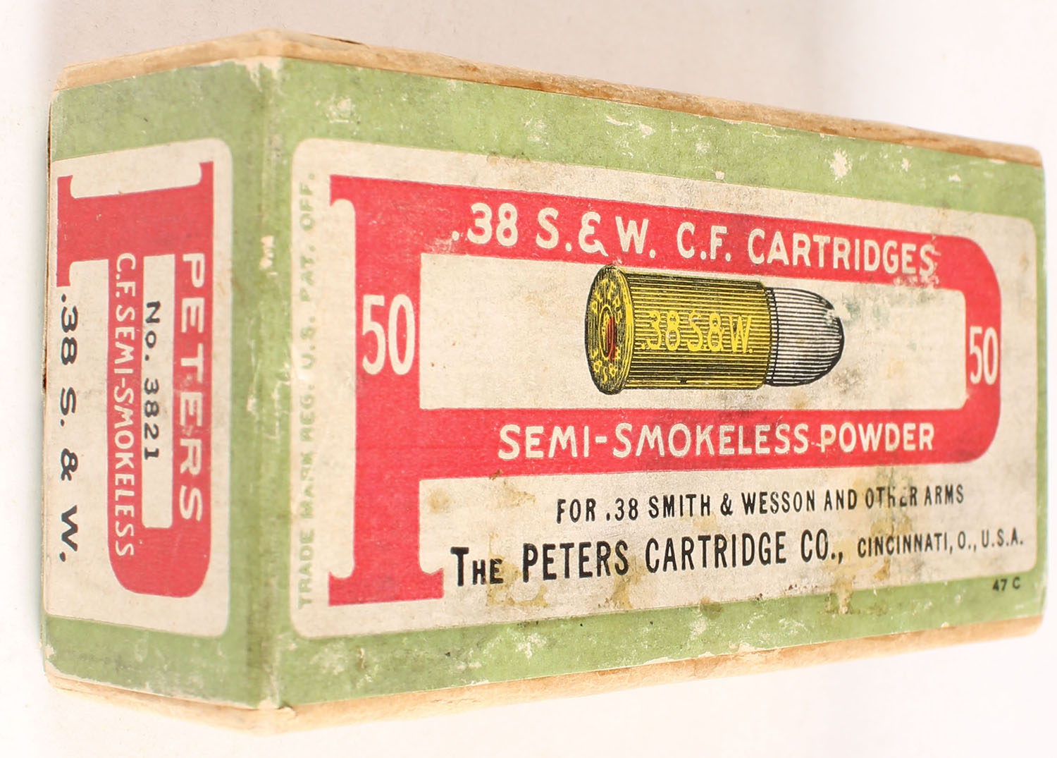 Peters, C.F. Cartridges, .38 Smith & Wesson, Semi-Smokeless Powder, Full, 2pc. Buff box with white green & red wraparound label, box is solid with very good color, some age soiling & shelf wear, very minor corner wear, edges are crisp, label is intact, ammo is very good. Grade: Excellent - Value: 30 to 120