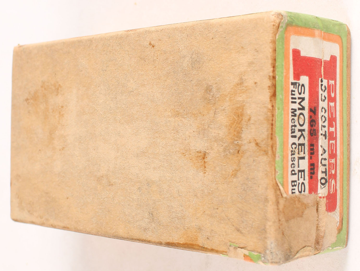 Peters, Smokeless C.F. Cartridges, .32 Colt Automatic (7.65mm), Full Metal Cased Bullet, FULL & SEALED, 2pc. Buff box with multi-colored top & side sealing labels, box is solid with very good color, some age soiling, minor edge & corner wear, labels are intact. Grade: Very Good ++ - Value: 30 to 120