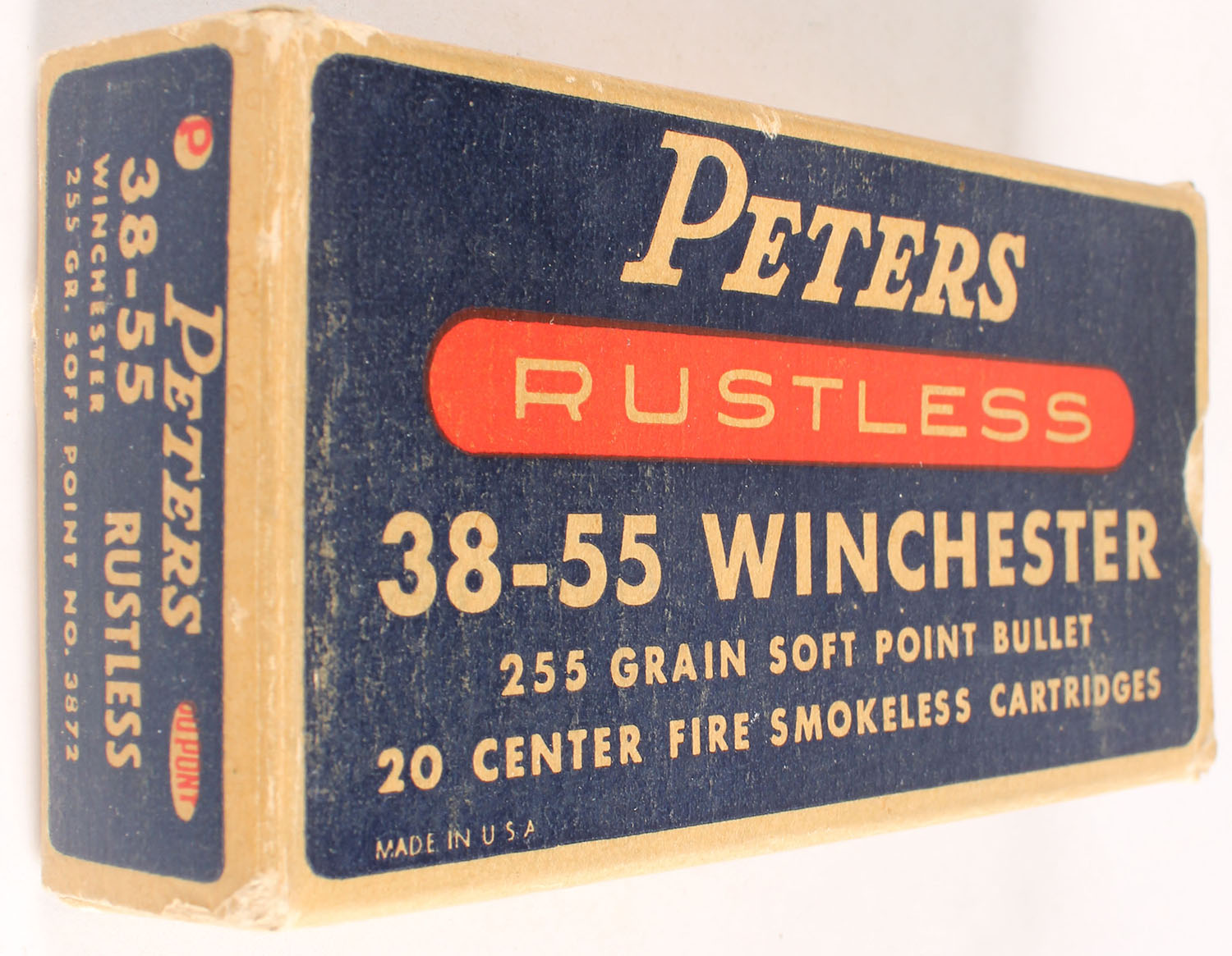 Peters, Rustless, .38-55 Winchester, 255 Grain Soft Point Bullet, Partial 16rds. 1pc. Blue white & red box, box is solid with very good to excellent color, minor age soiling & shelf wear, minor corner wear, edges are crisp, end flaps are solid, ammo is excellent. Grade: Excellent - Value: 20 to 60