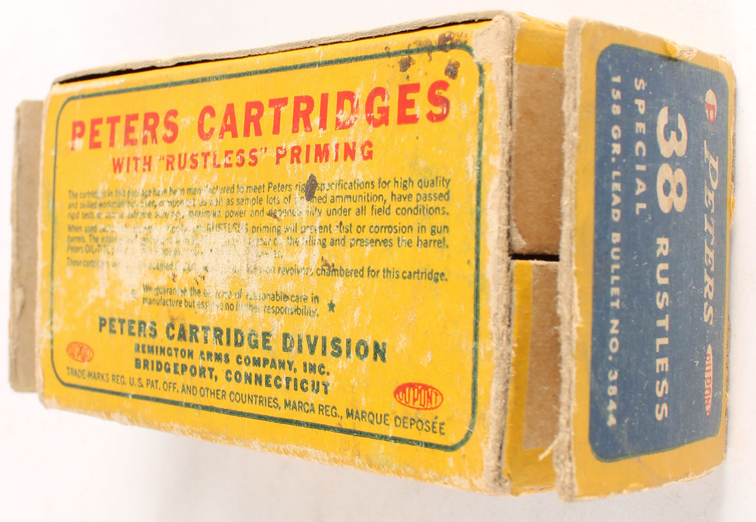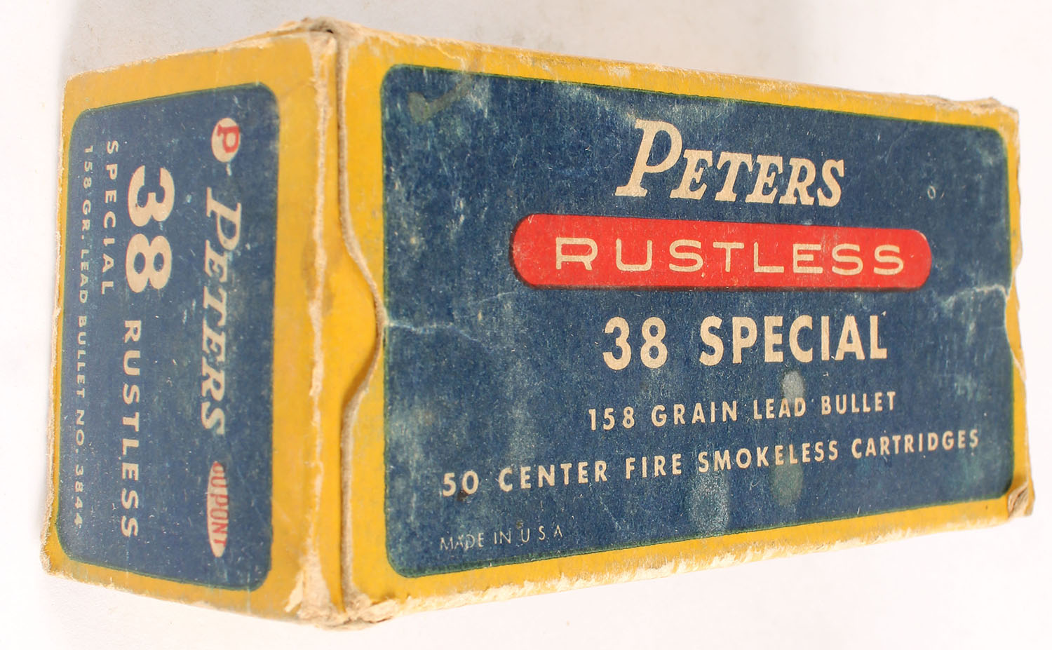Peters, Rustless, .38 Special, 158 Grain Lead Bullet, Full, 1pc. Blue yellow & red box, both end flaps are torn, very good color, some age soiling & shelf wear, some edge & corner wear, ammo is excellent. Grade: Good + - Value: 10 to 50