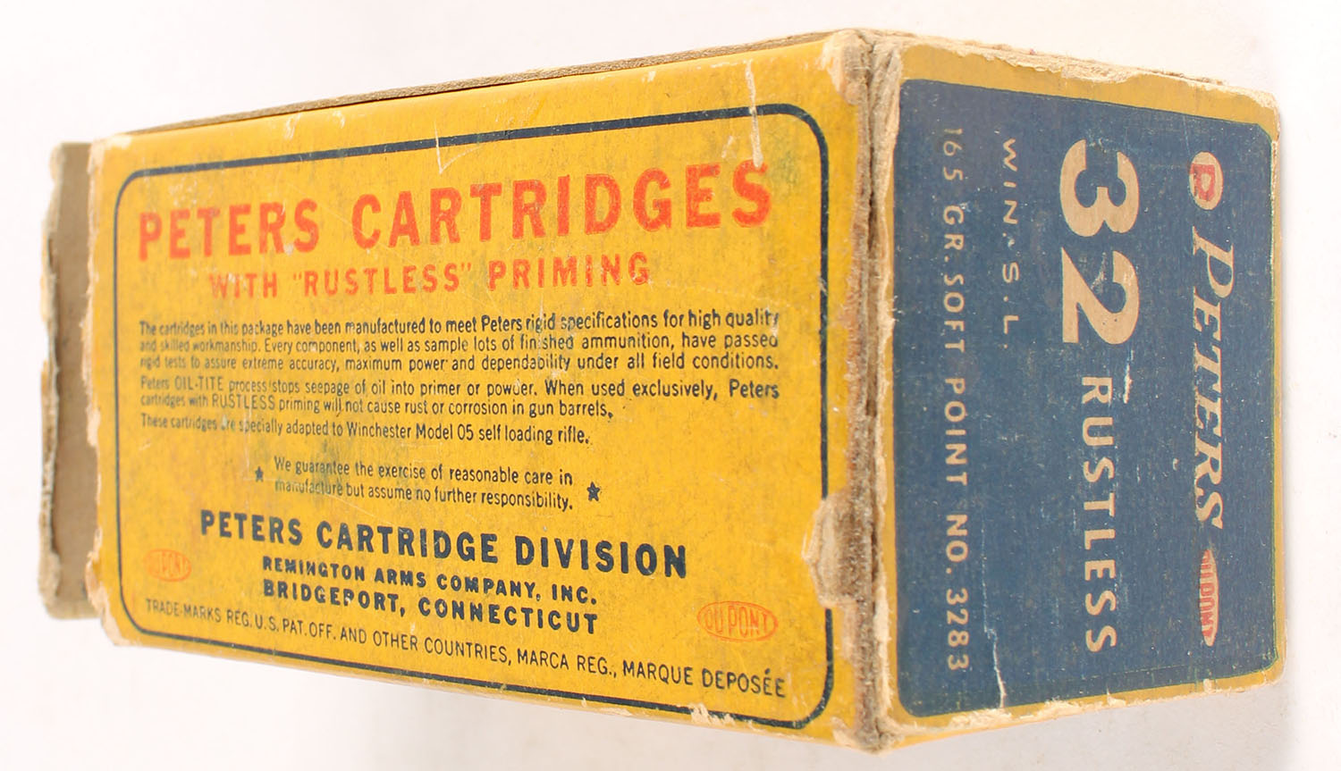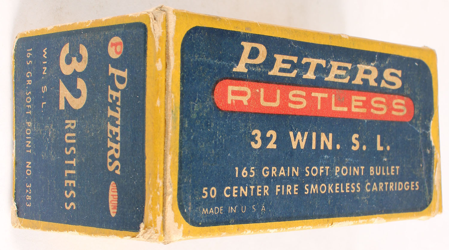 Peters, Rustless, .32 Winchester Self-Loading, 165 Grain Soft Point, Partial 25rds. 1pc. Blue yellow & red box, both end flaps are torn, very good color, some age soiling & shelf wear, some edge & corner wear, ammo is excellent. Grade: Very Good - Value: 20 to 80