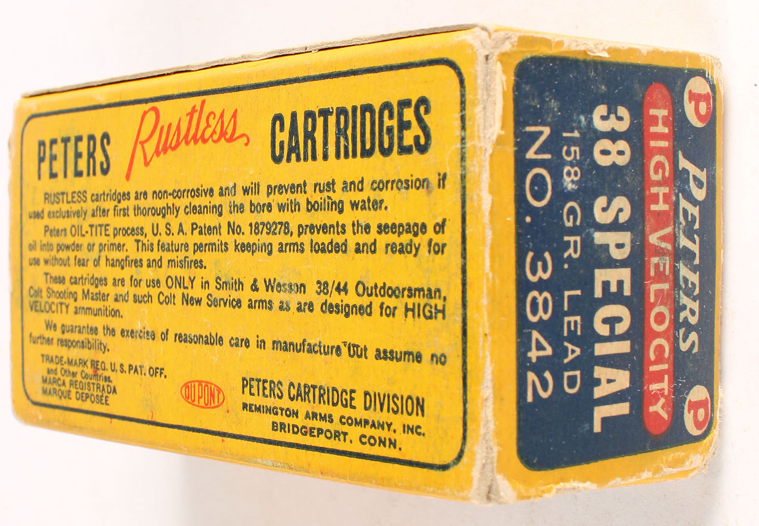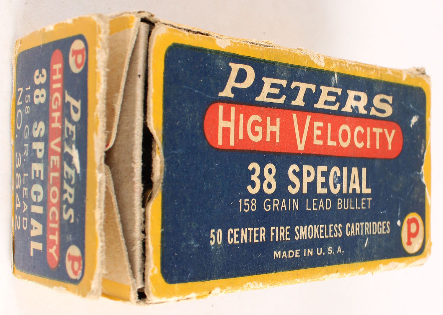 Peters, High Velocity, .38 Special, 158 Grain Lead Bullet, Full, 1pc. Blue yellow & red box, box is solid with excellent color, some shelf wear, edge & corner wear, insert tab of left end flap is torn off, right end flap is solid, ammo is very good to excellent. Grade: Good ++ - Value: 10 to 50