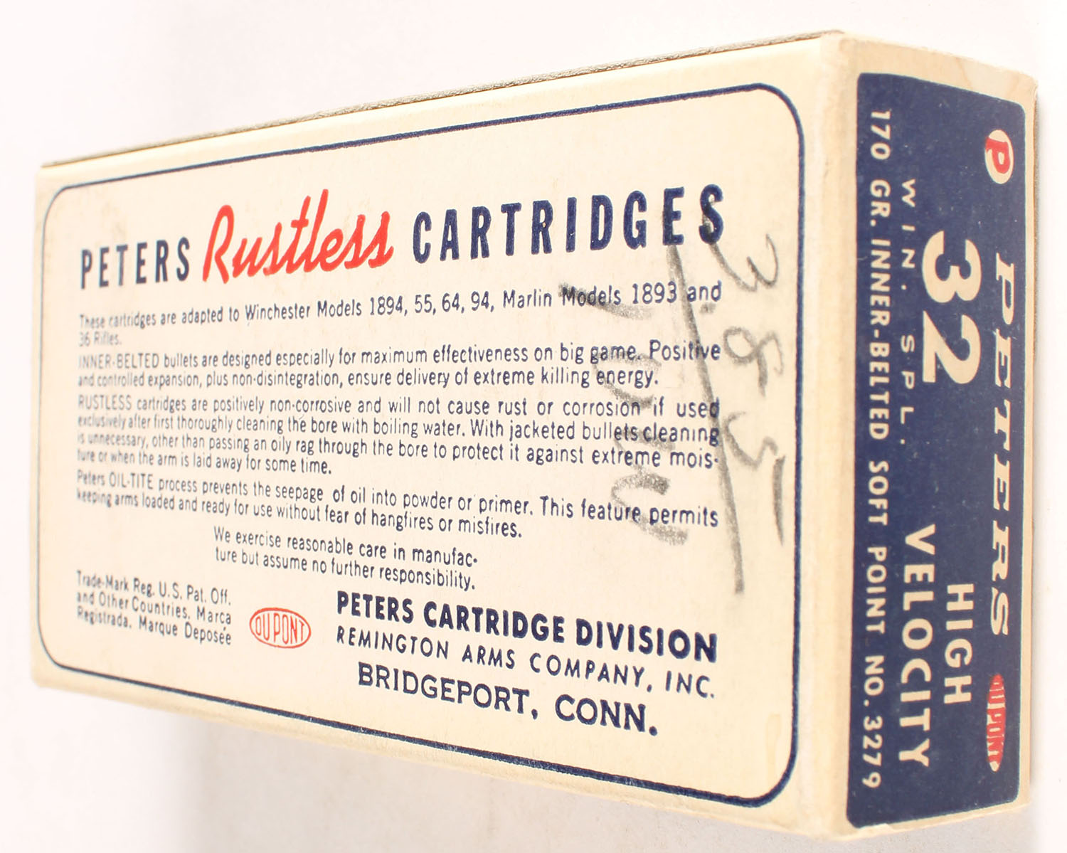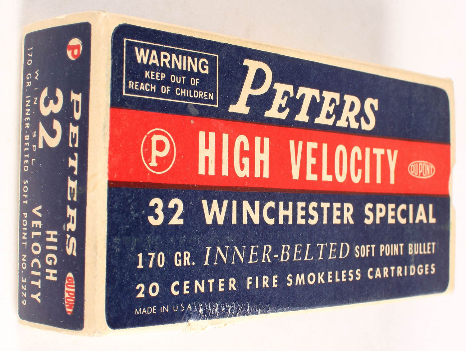Peters, High Velocity, .32 Winchester Special, 170 Grain Inner-Belted Soft Point Bullet, Full, 1pc. Blue white & red box, box is solid with excellent color, edge ding on front edge, very minor corner wear, edges are mostly crisp, end flaps are solid, ammo is excellent. Grade: Excellent + - Value: 20 to 60