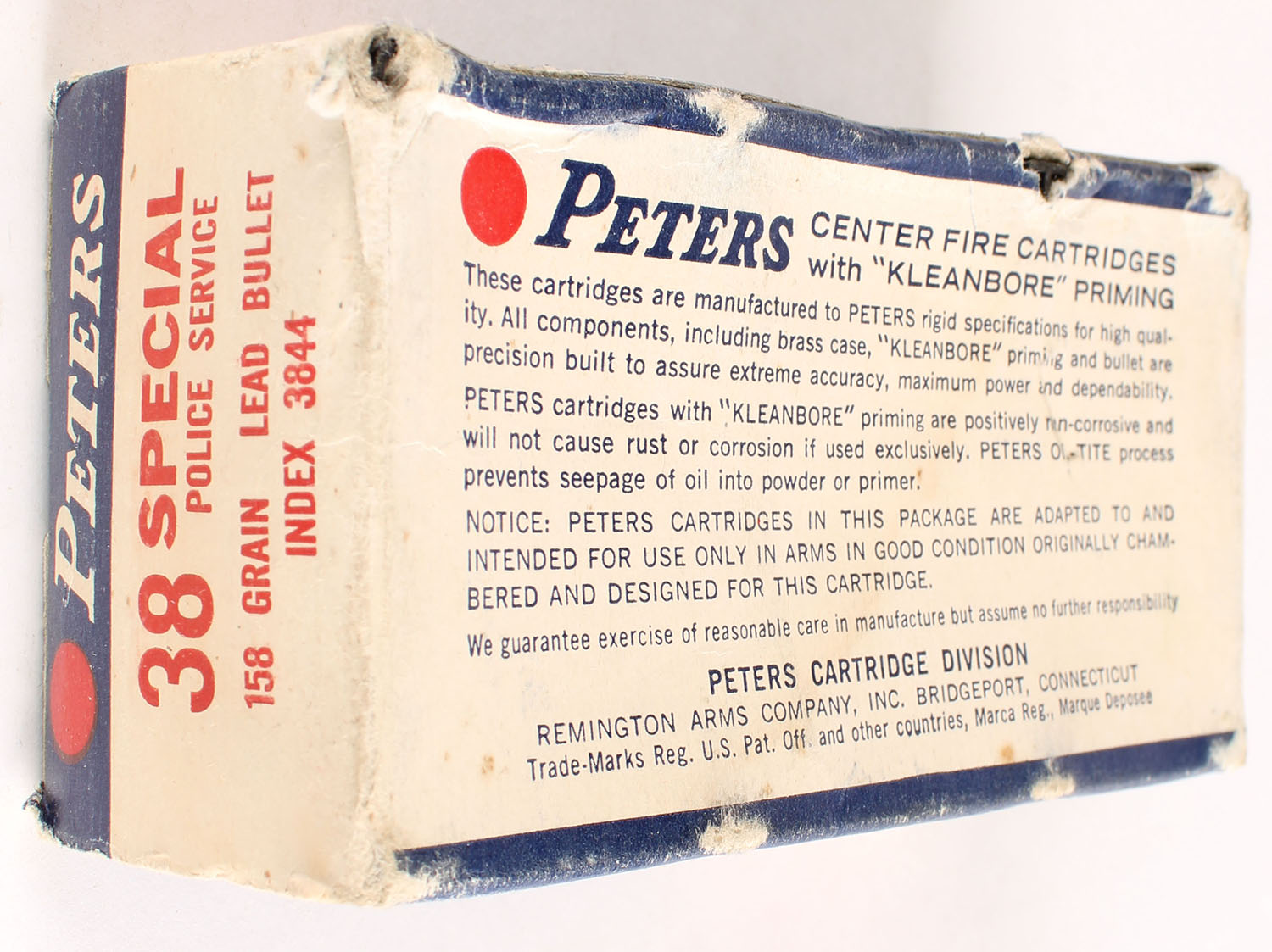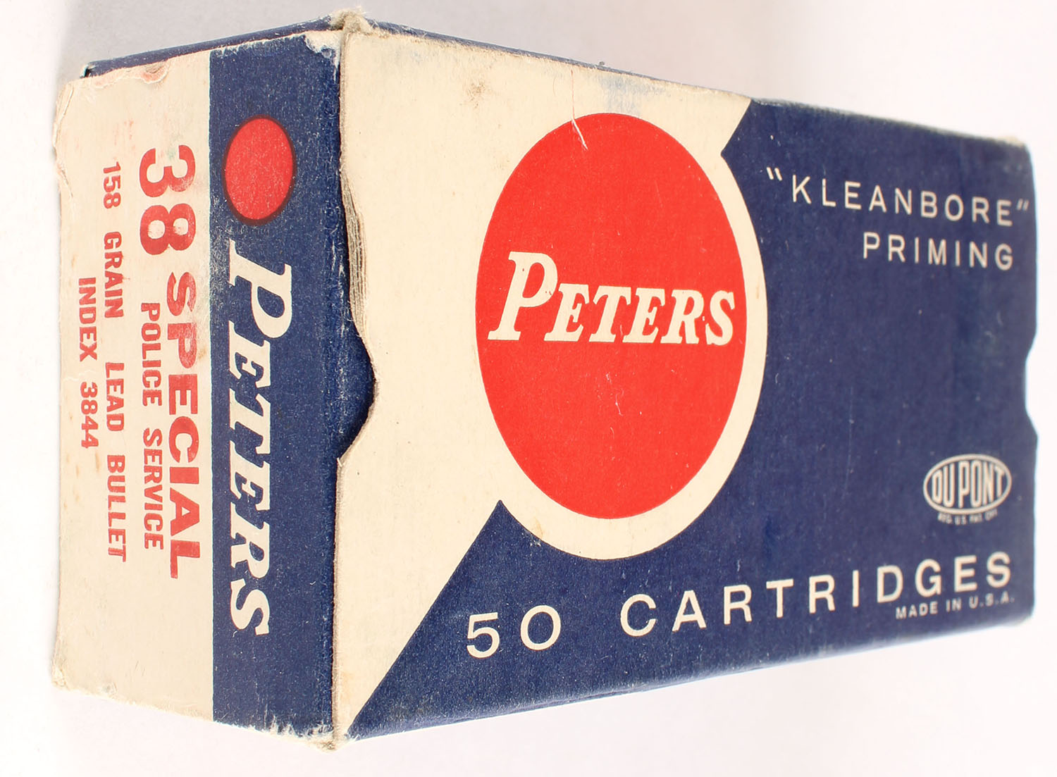 Peters, ''Kleanbore'' Priming, .38 Special Police Service, 158 Grain Lead Bullet, Full, 1pc. Blue white & red box, box is solid with excellent color, very minor age soiling, some corner wear, edge wear, end flaps are solid, ammo is excellent. Grade: Very Good ++ - Value: 10 to 50