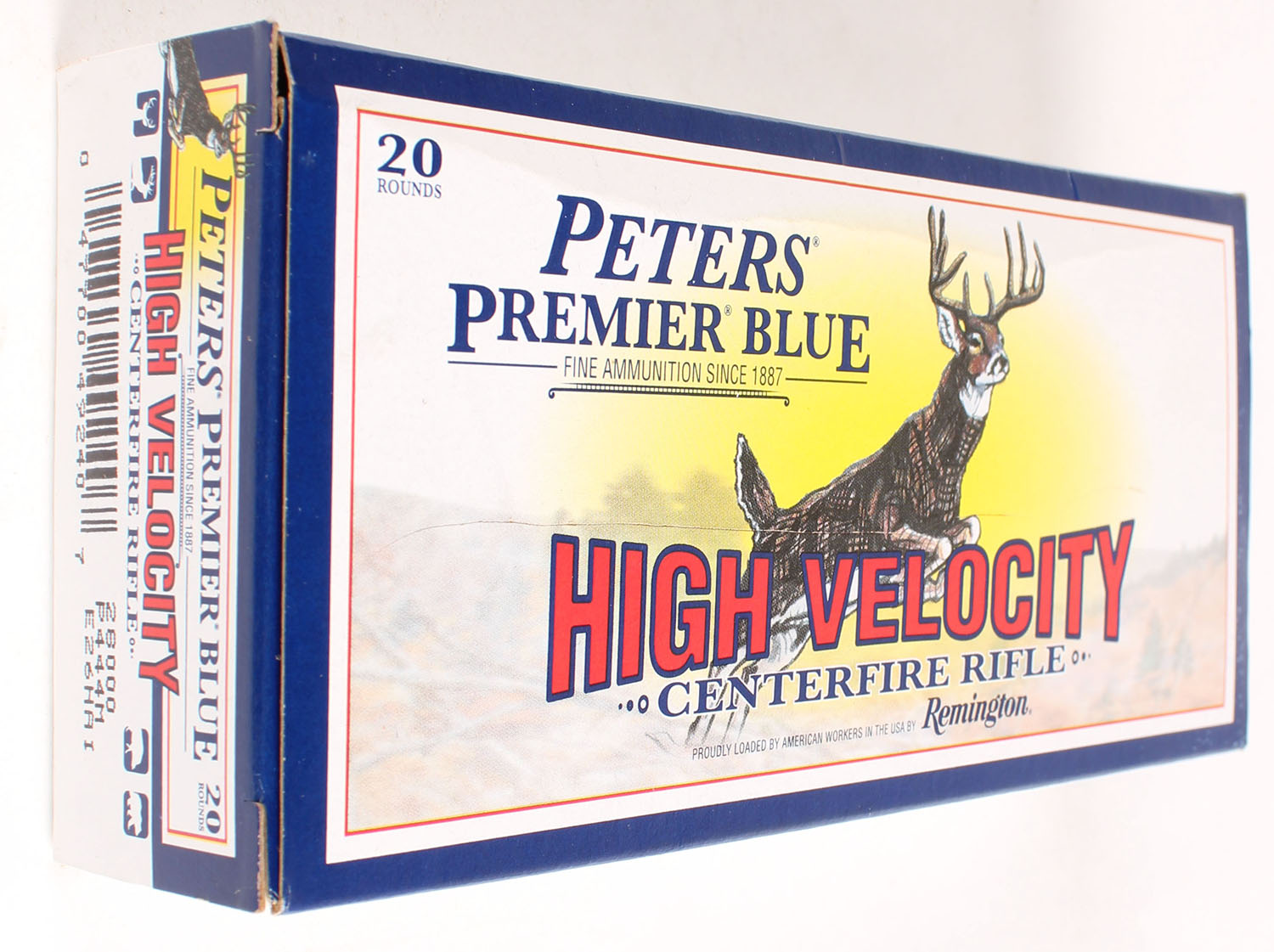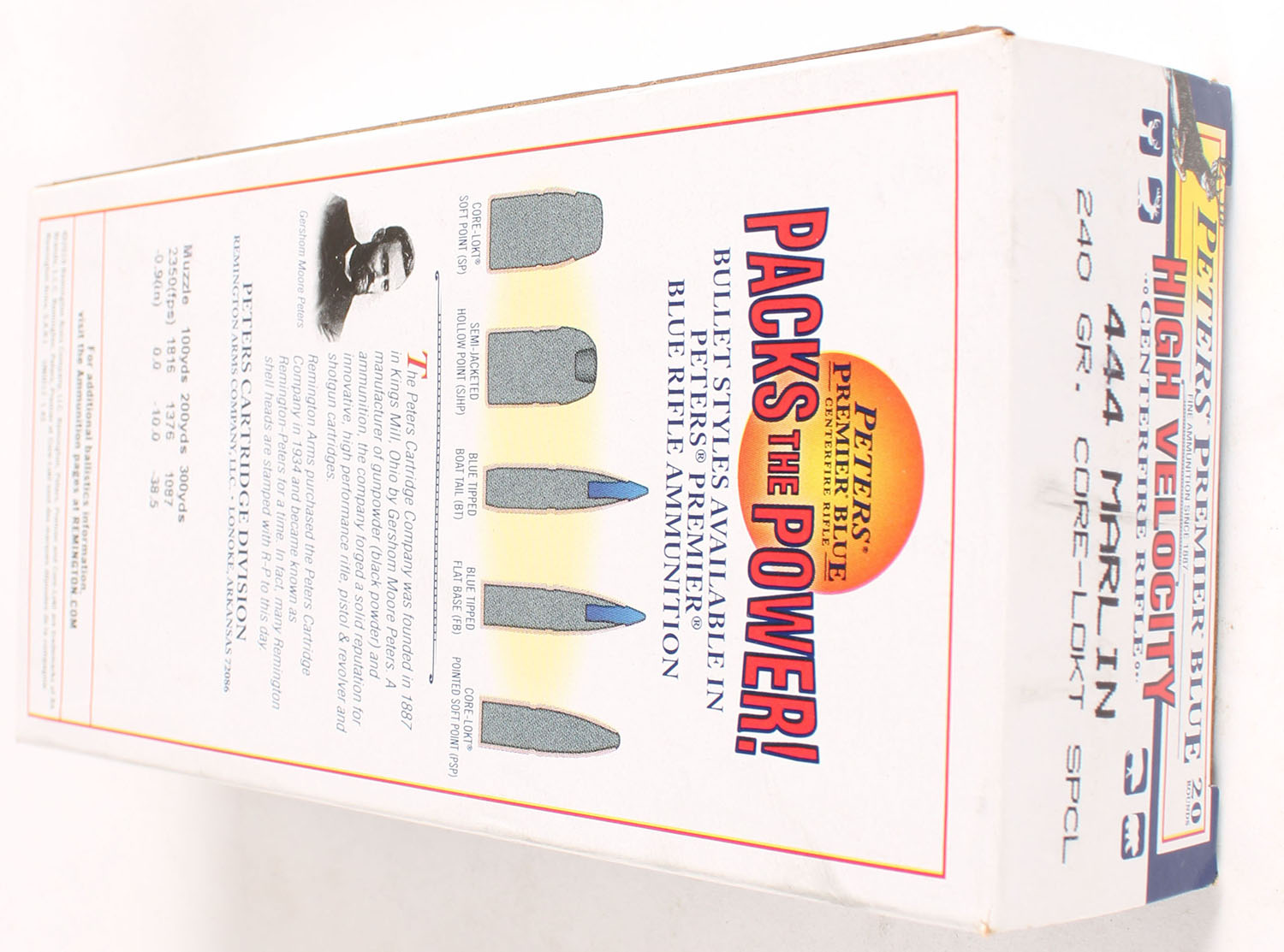 Peters, Premier Blue High Velocity, .444 Marlin, 240 Gr. Core-Lokt Special, Full, 1pc. White & blue box, box is near mint with minty color, only has a crease on top, corners are sharp, edges are crisp, end flaps are solid, ammo is excellent. Grade: Excellent ++ - Value: 60 to 180
