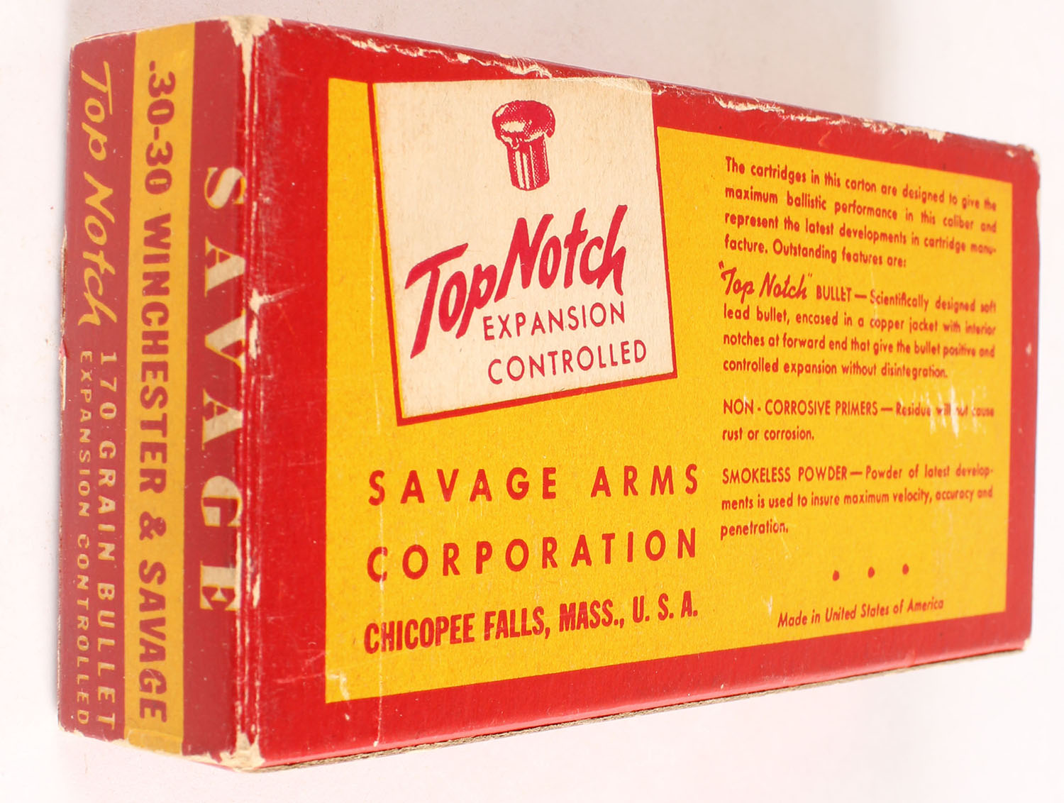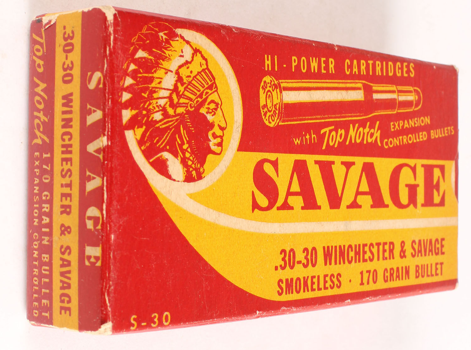 Savage, Hi-Power Cartridges, .30-30 Winchester, Smokeless, 170 Grain Top Notch Expansion Controlled Bullet, Full, 1pc. Red & yellow box, box is solid with excellent color, minor age soiling & corner wear, very minor edge wear, end flaps are solid, ammo is excellent. Grade: Excellent + - Value: 70 to 210