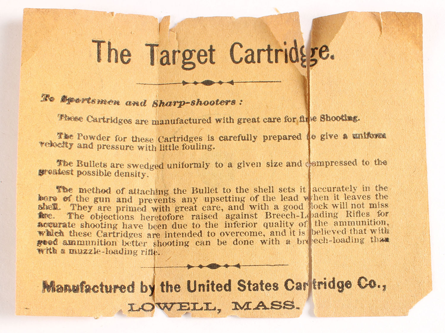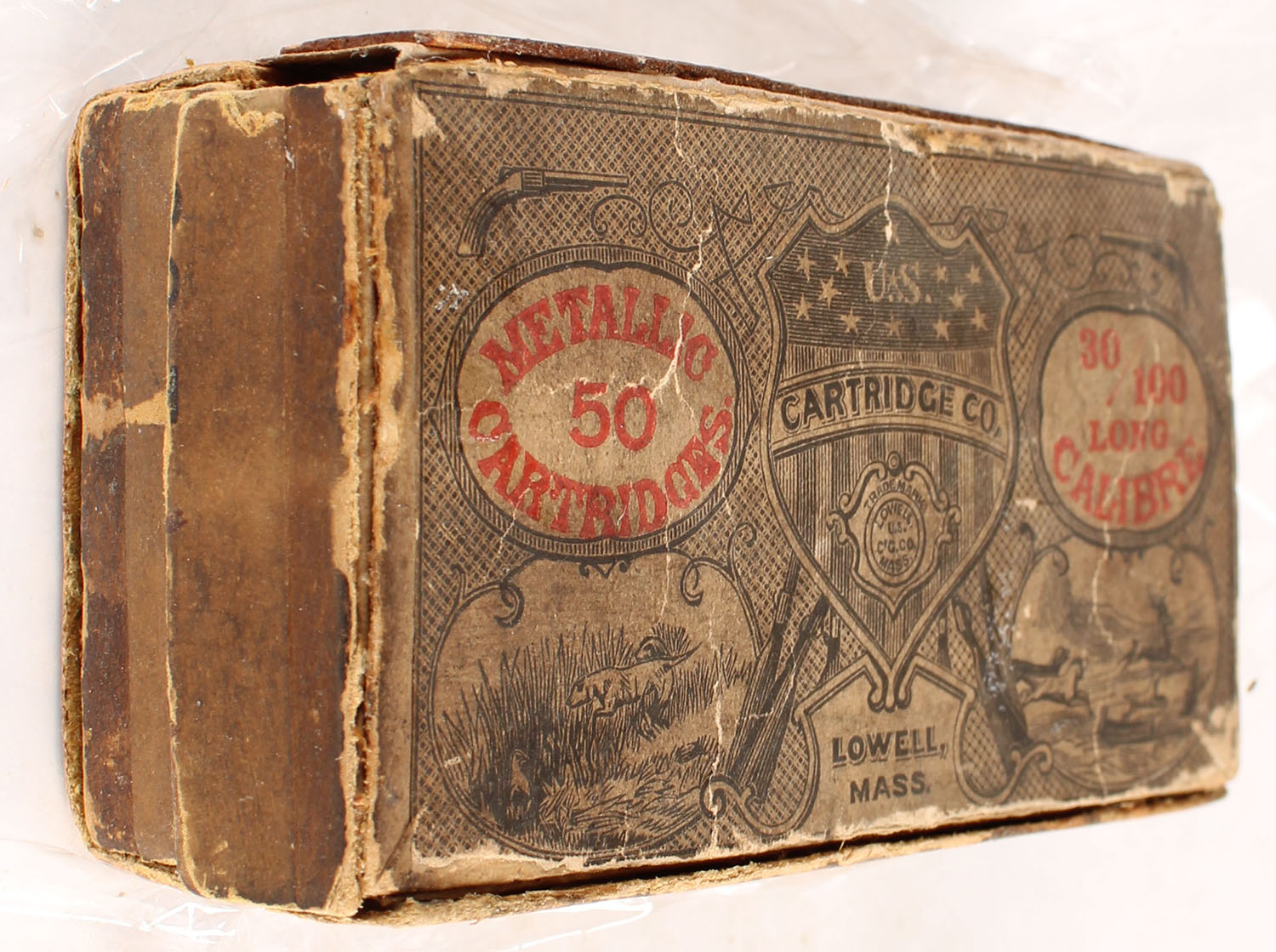 U.S., Metallic Cartridges, .30 Long Rim Fire, Partial 43rds., 2pc. Buff box with gray top & buff side sealing labels, all sides & ends of lid have been torn & repaired, missing back side of lid, fair to good color, age soiling edge & corner wear, side sealing label is 90% intact, ammo is very good. Grade: Good ++ - Value: 30 to 90