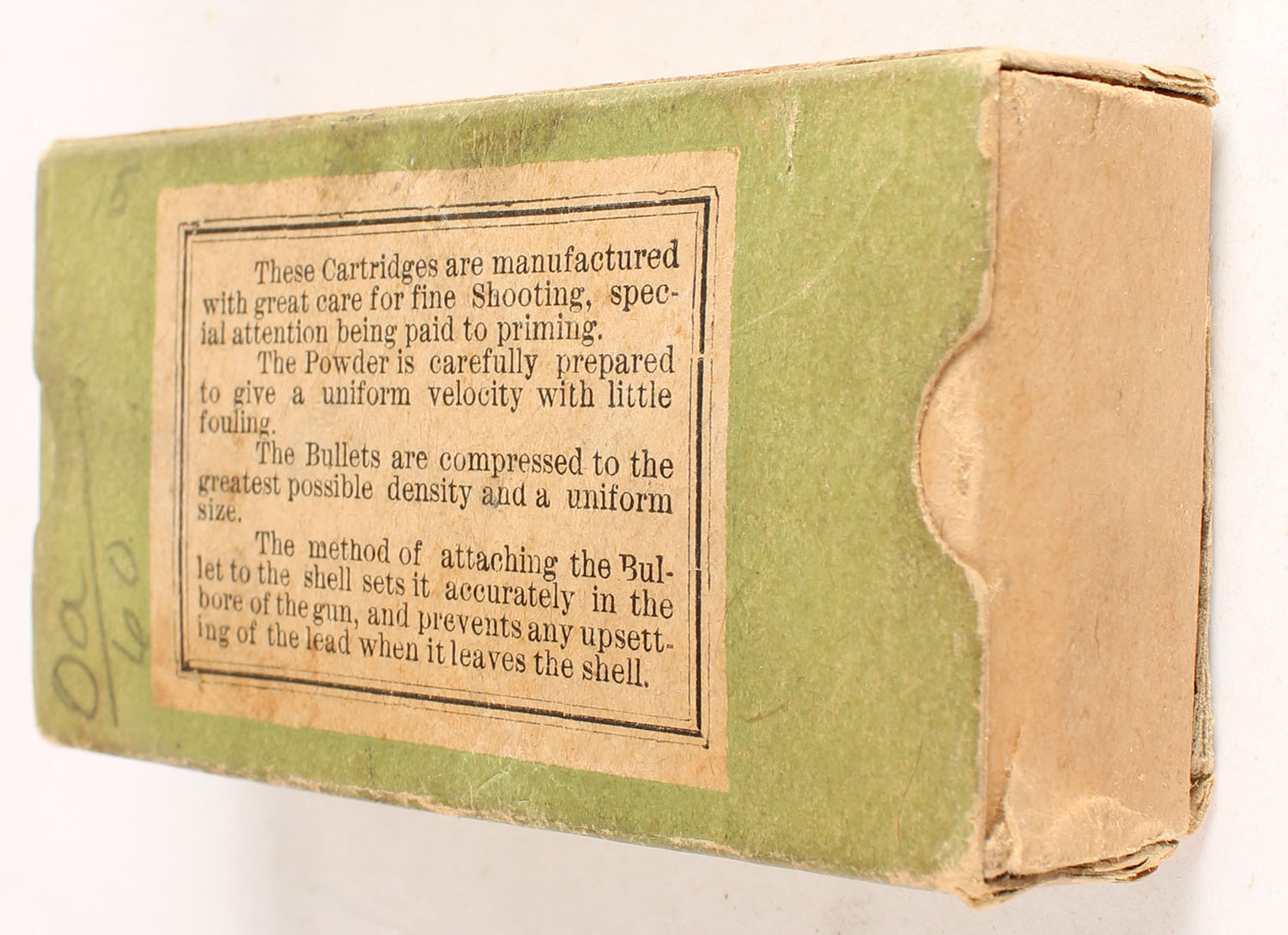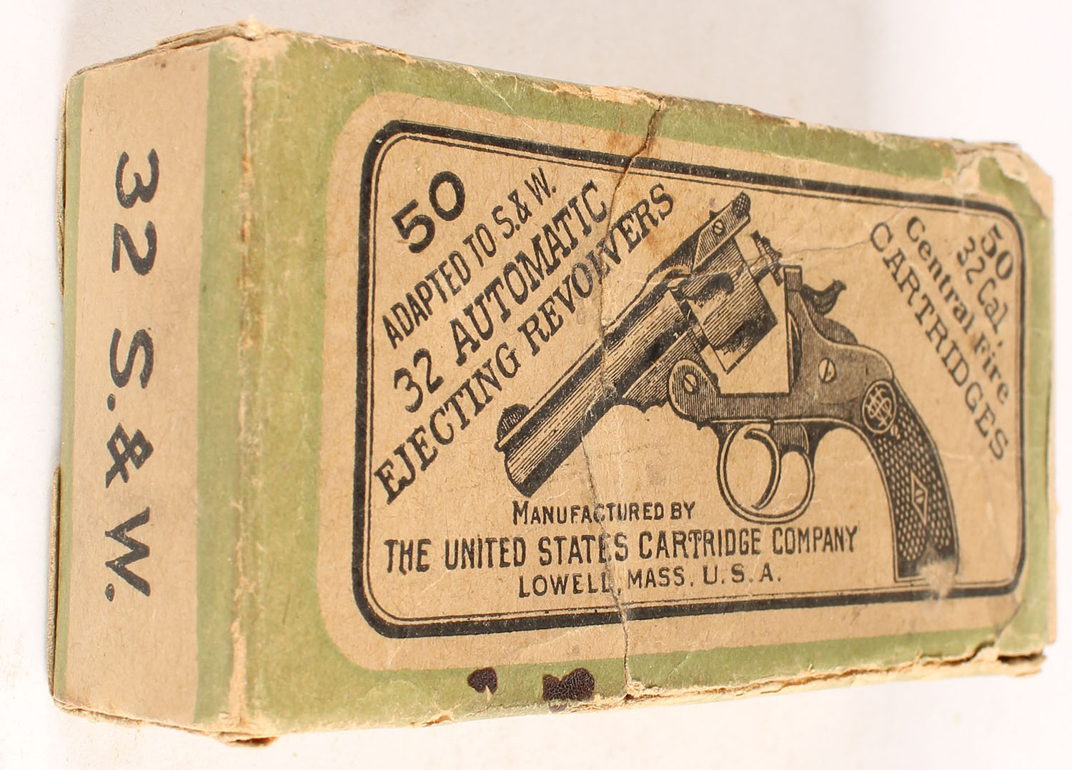 U.S., Central Fire Cartridges, .32 Smith & Wesson, Full of mixed ammo, 1pc. Buff black & green box, missing right end flap, very good color, some age soiling & shelf wear, edge & comer wear, left end flap is solid, ammo is fair. Grade: Good - Value: 10 to 50