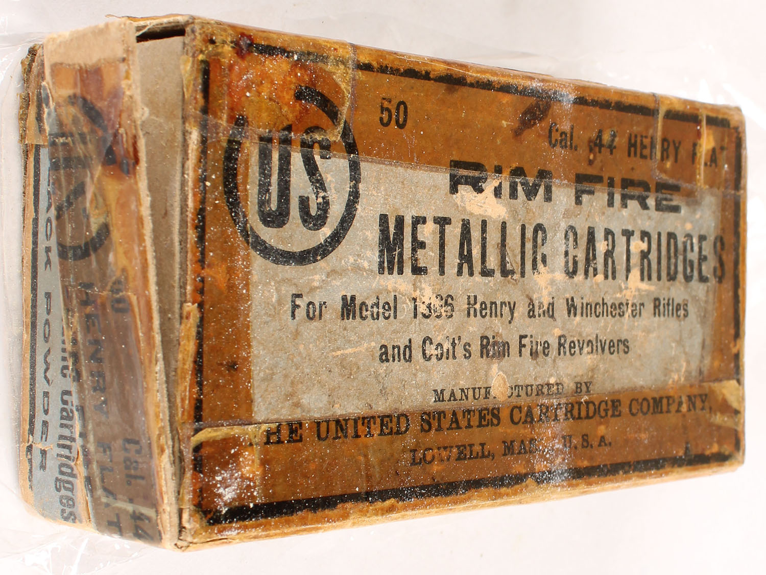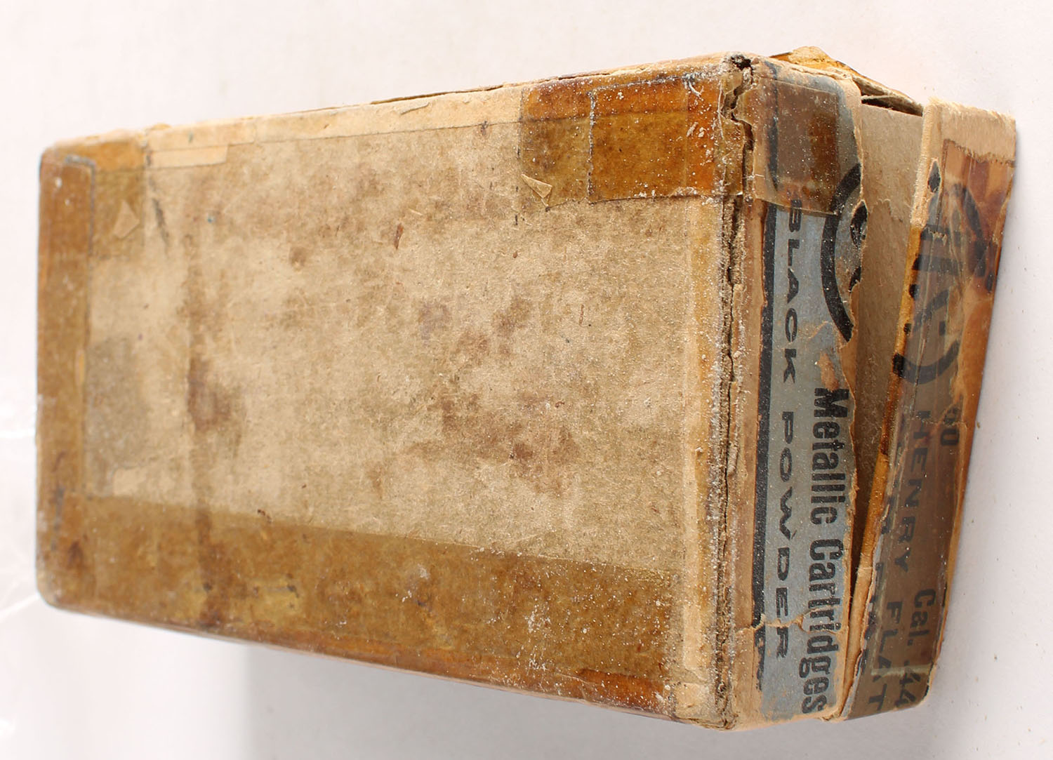 U.S., Metallic Cartridges, .44 Henry Flat Rim Fire, Full, 2pc. Buff box with blue top & side sealing labels, box has tape on all seams, (3) seam splits to bottom edges, seam split to left edge of lid, vertical seam split to back left corner of lid, good color, age soiling, shelf wear, some edge & corner wear, labels are intact, ammo is good. Grade: Fair - Value: 500 to 1500