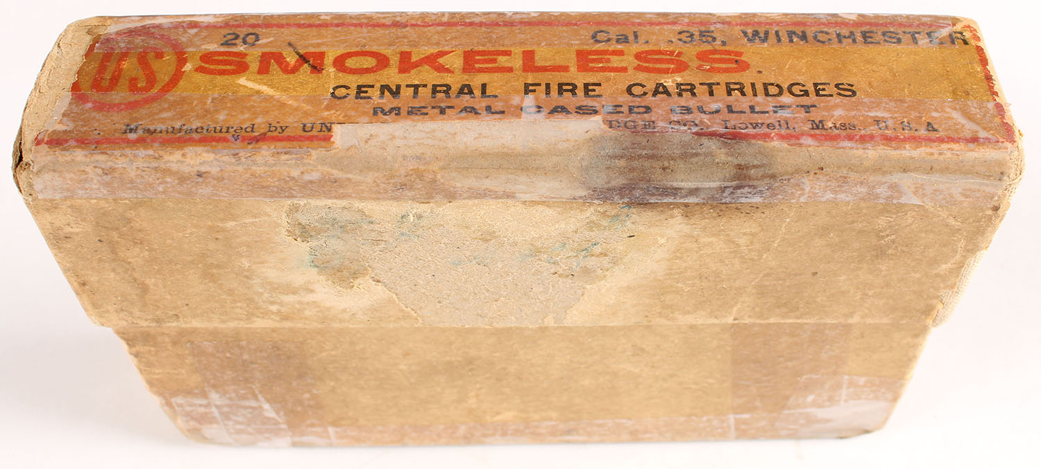 U.S., Smokeless Central Fire Cartridges, .35 Winchester, Metal Cased Bullets, Full of mixed H/S, 2pc. Buff box with orange & red label, box is solid with fair color, age soiling, some staining & shelf wear, entire bottom is taped, tape on front edge of lid, seam split to left edge of lid, edge & corner wear, top label is intact, ammo is excellent. Grade: Fair ++ - Value: 30 to 90