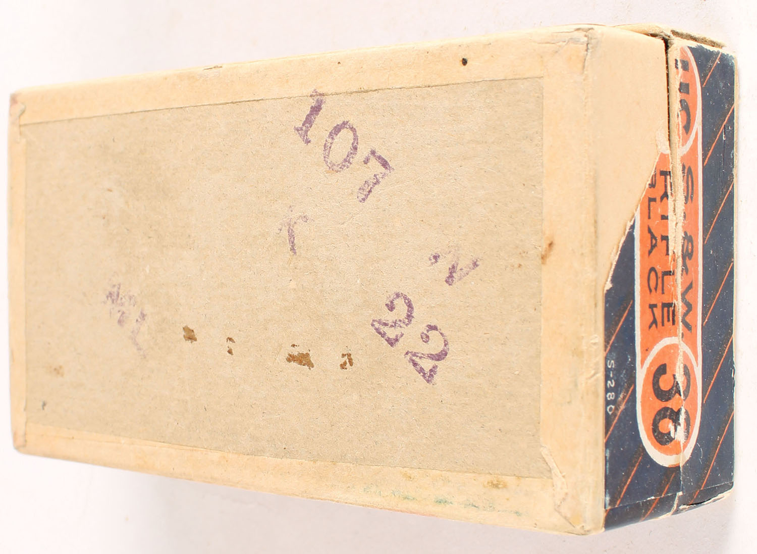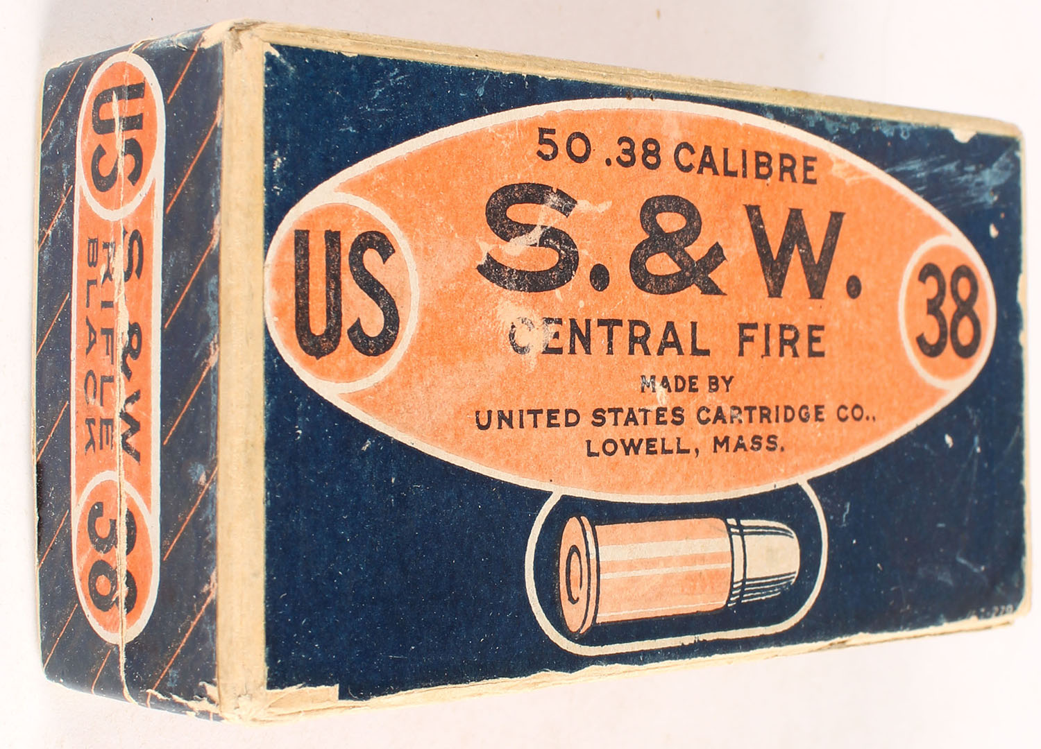 U.S., Central Fire, .38 Smith & Wesson, Black Powder, Full, 2pc. Buff box with blue/orange top & side sealing labels, box is solid with very good color, minor age soiling, vertical seam split to front right corner, partial seam split to top front edge, corner wear, very minor edge wear, side sealing label is 99% intact, ammo is very good to excellent. Grade: Very Good ++ - Value: 16 to 60