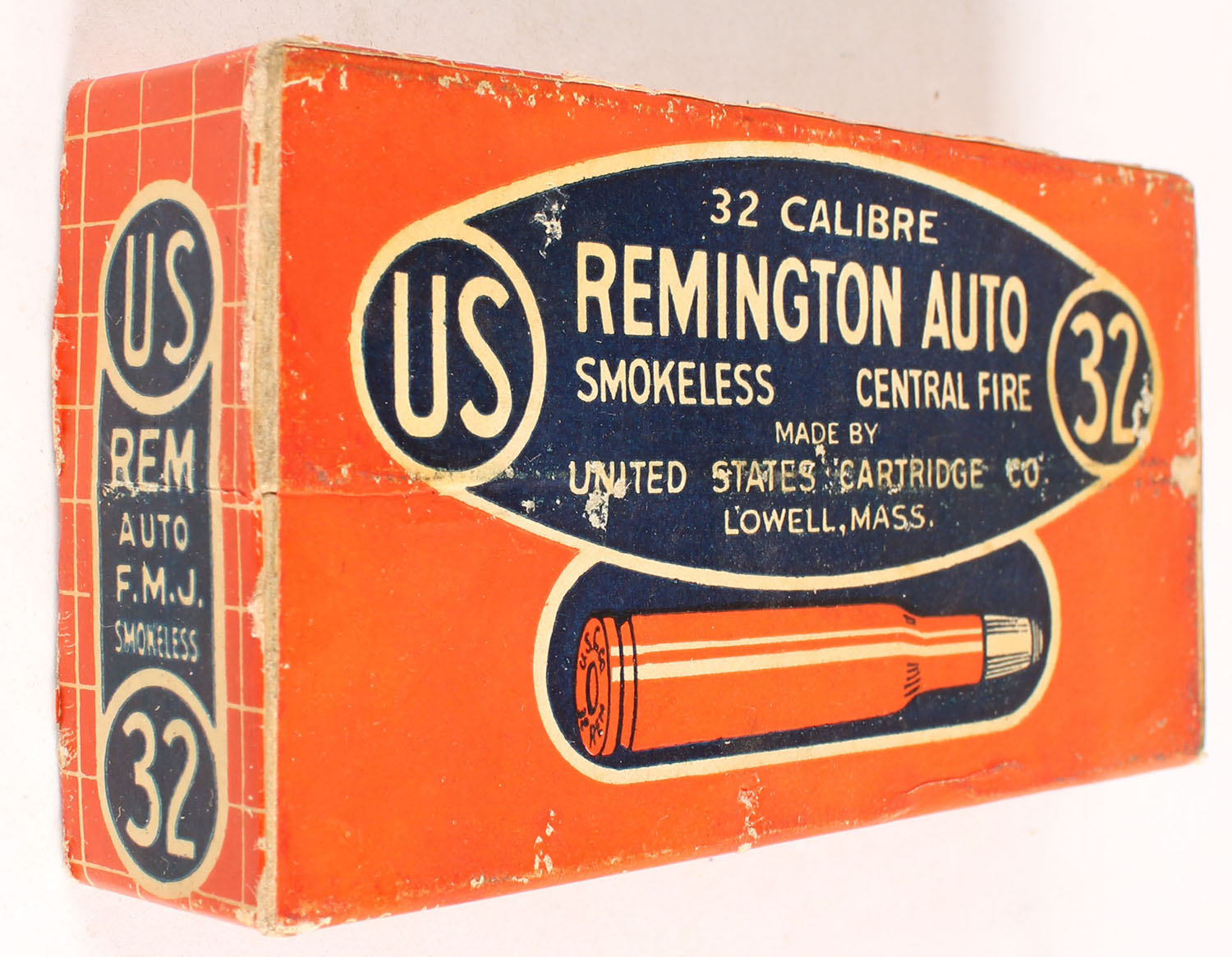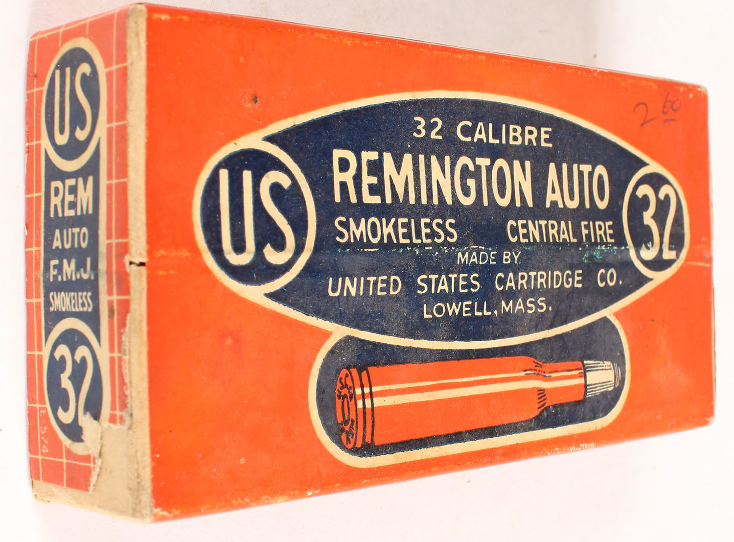 U.S., Smokeless Central Fire, .32 Remington Autoloading, Full Metal-Jacketed Bullet, FULL & SEALED, 2pc. Buff box with orange & blue labels, box is solid with excellent color, very minor age soiling & shelf wear, corners are mostly sharp, edges are mostly crisp, labels are intact. Grade: Excellent + - Value: 50 to 150
