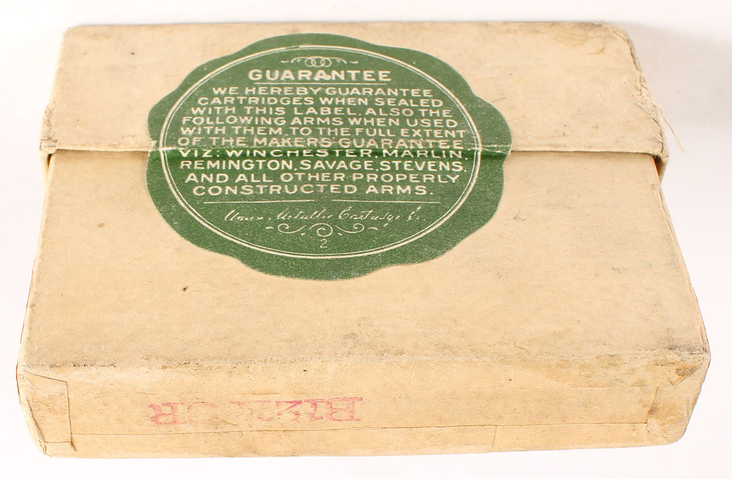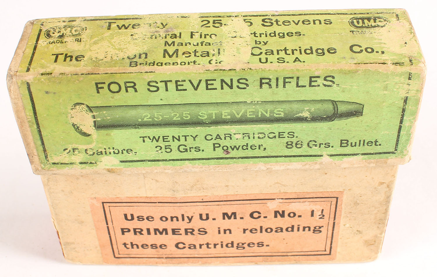 UMC, Central Fire Cartridges, .25-25 Stevens, 86 Grs. Bullet, FULL & SEALED, 2pc. Buff box with green label, box is solid with very good color, shelf wear, some edge & corner wear label is intact. Grade: Very Good + - Value: 70 to 210