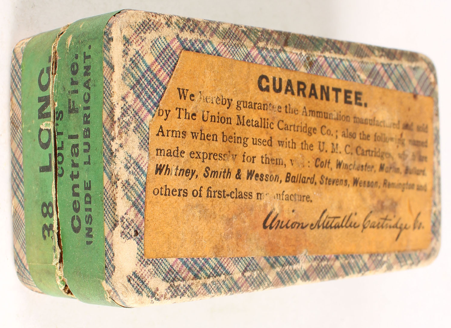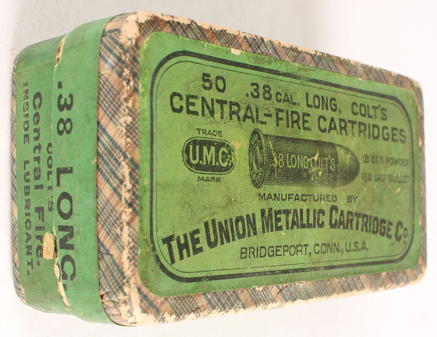 UMC, Central-Fire Cartridges, .38 Long Colt, 18 Grs. Powder, 150 Grs. Bullet, Full, 2pc. Purple fabric box with green top & side sealing labels, box is solid with very good color, some age soiling, some edge & corner wear, labels are intact, ammo is very good. Grade: Very Good + - Value: 20 to 80