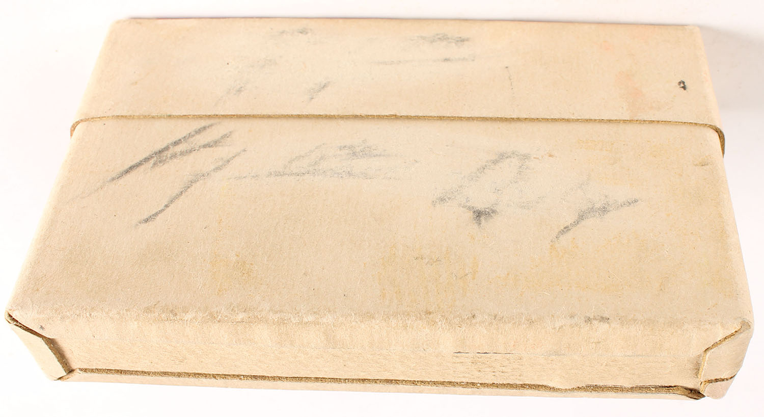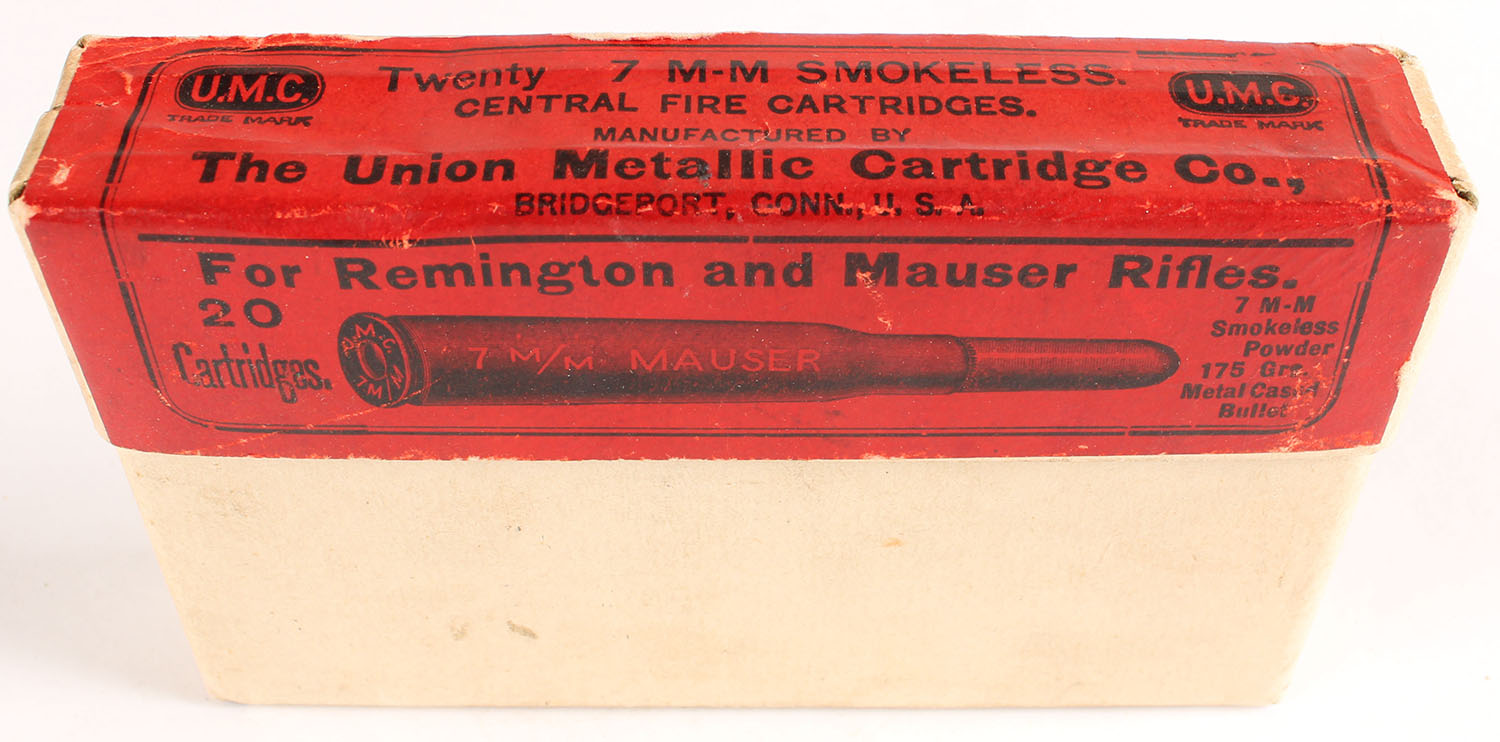 UMC, Central Fire Cartridges, 7mm Mauser, 175 Grs. Metal Cased Bullet, Full, 2pc. Buff box with red label, box is solid with excellent color, very minor corner wear, edges are mostly crisp, label is intact, ammo is excellent. Grade: Excellent + - Value: 30 to 90