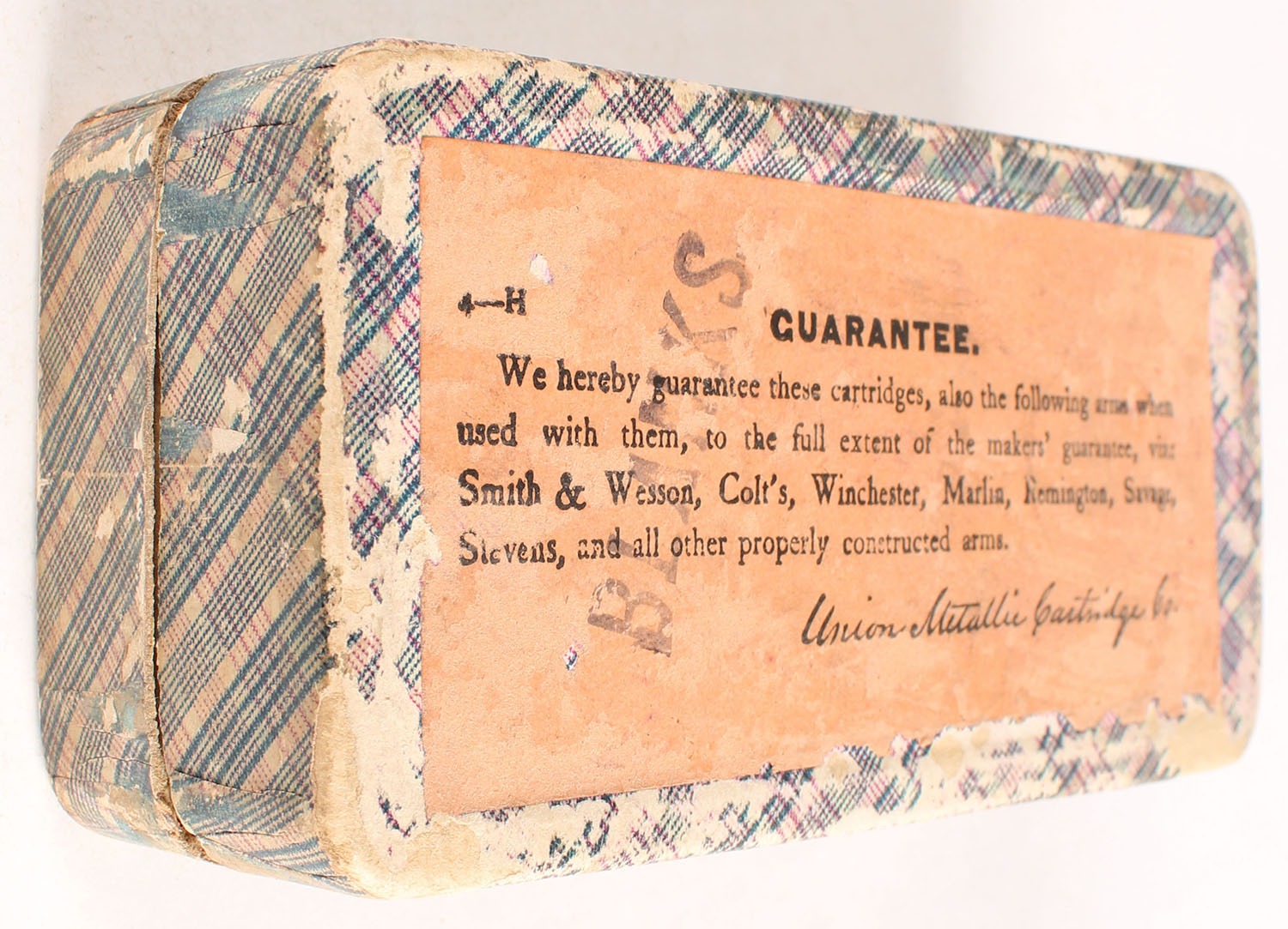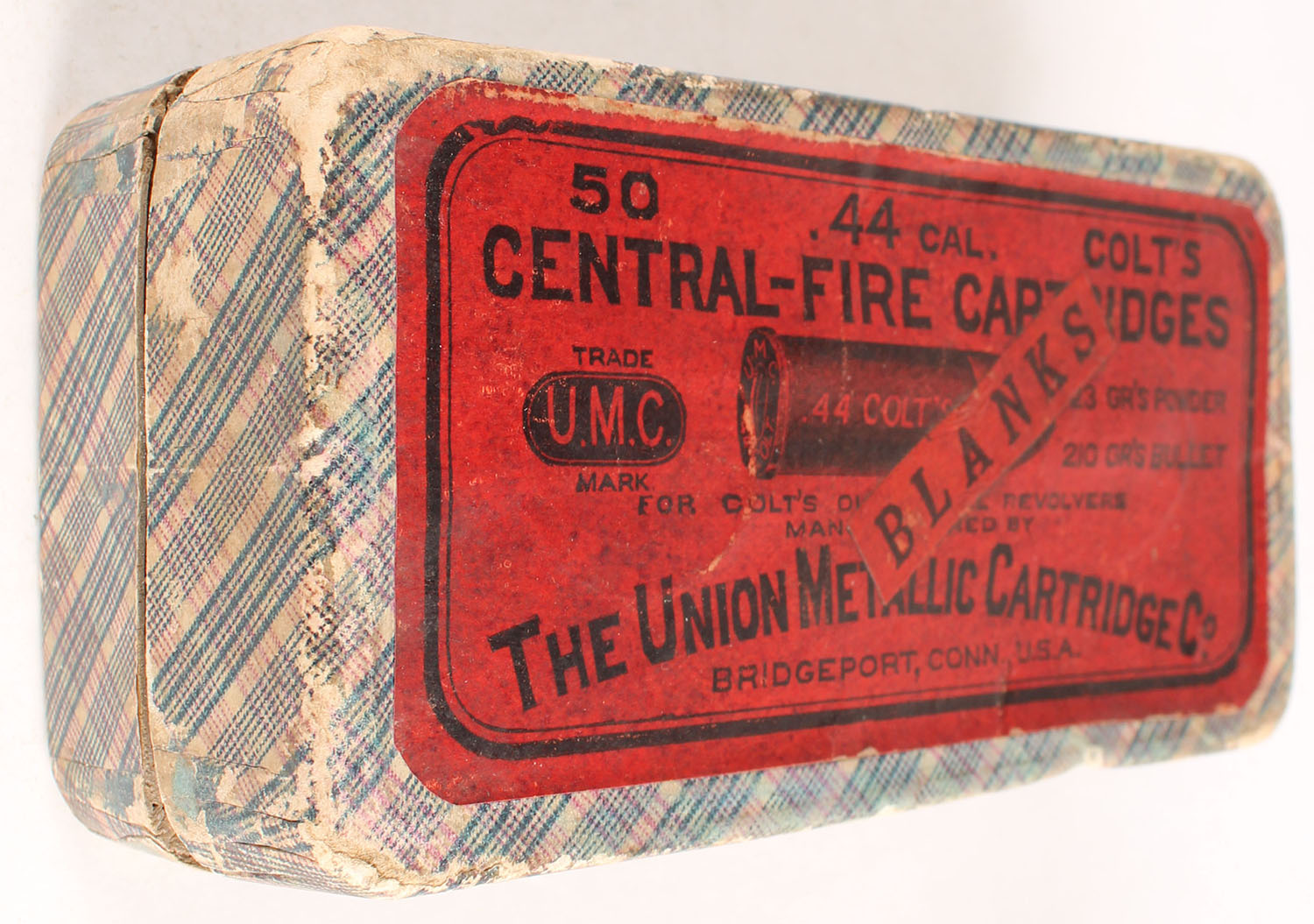 UMC, Central-Fire Cartridges, .44 Colt Blanks, Full, 2pc. Blue fabric box with red top label & red 'Blanks' over-label, box is solid with very good to excellent color, some age soiling & shelf wear, some edge & corner wear, top label is intact, side sealing label is missing, ammo is good to very good. Grade: Very Good - Value: 16 to 60