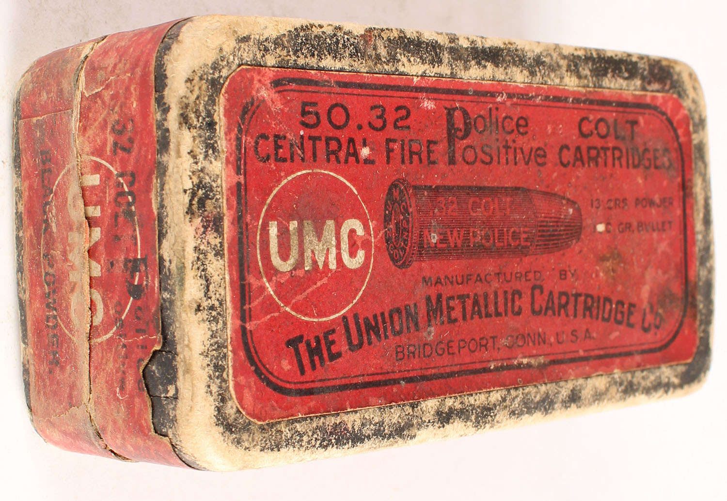 UMC, Central-Fire Cartridges, .32 Colt Police Positive, Black Powder, Full, of mixed H/S, 2pc. Black mottled box with red top & side sealing labels, box is solid with very good color, some age soiling & staining, edge & corner wear, labels are intact, ammo is good. Grade: Good ++ - Value: 8 to 40