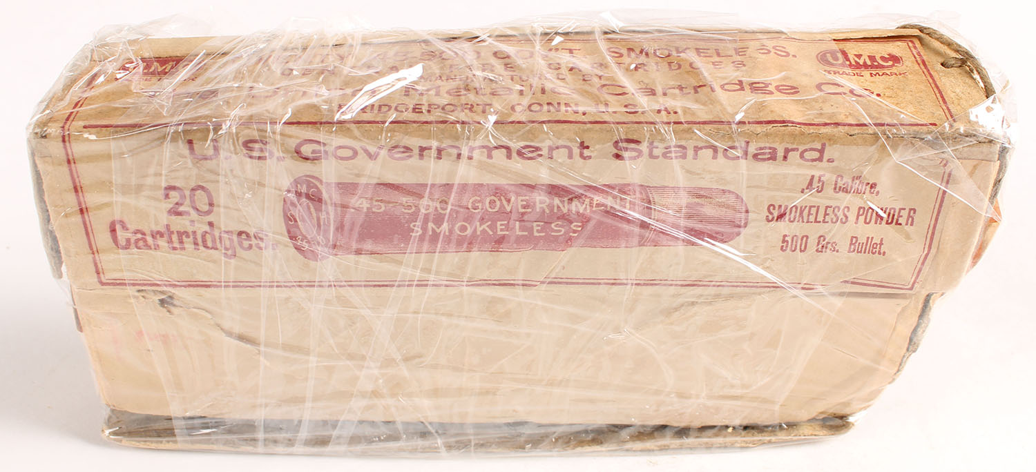UMC, Central Fire Cartridges, .45-500 Government, 500 Grs. Bullet, Full, 2pc. Buff box with buff & red label, structural integrity of box is compromised, several seam splits, bottom is torn off, excellent color, ammo is excellent. Grade: Fair - Value: 20 to 60
