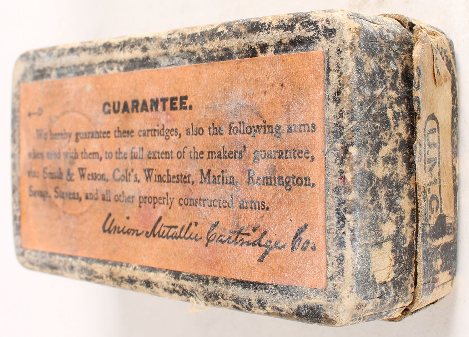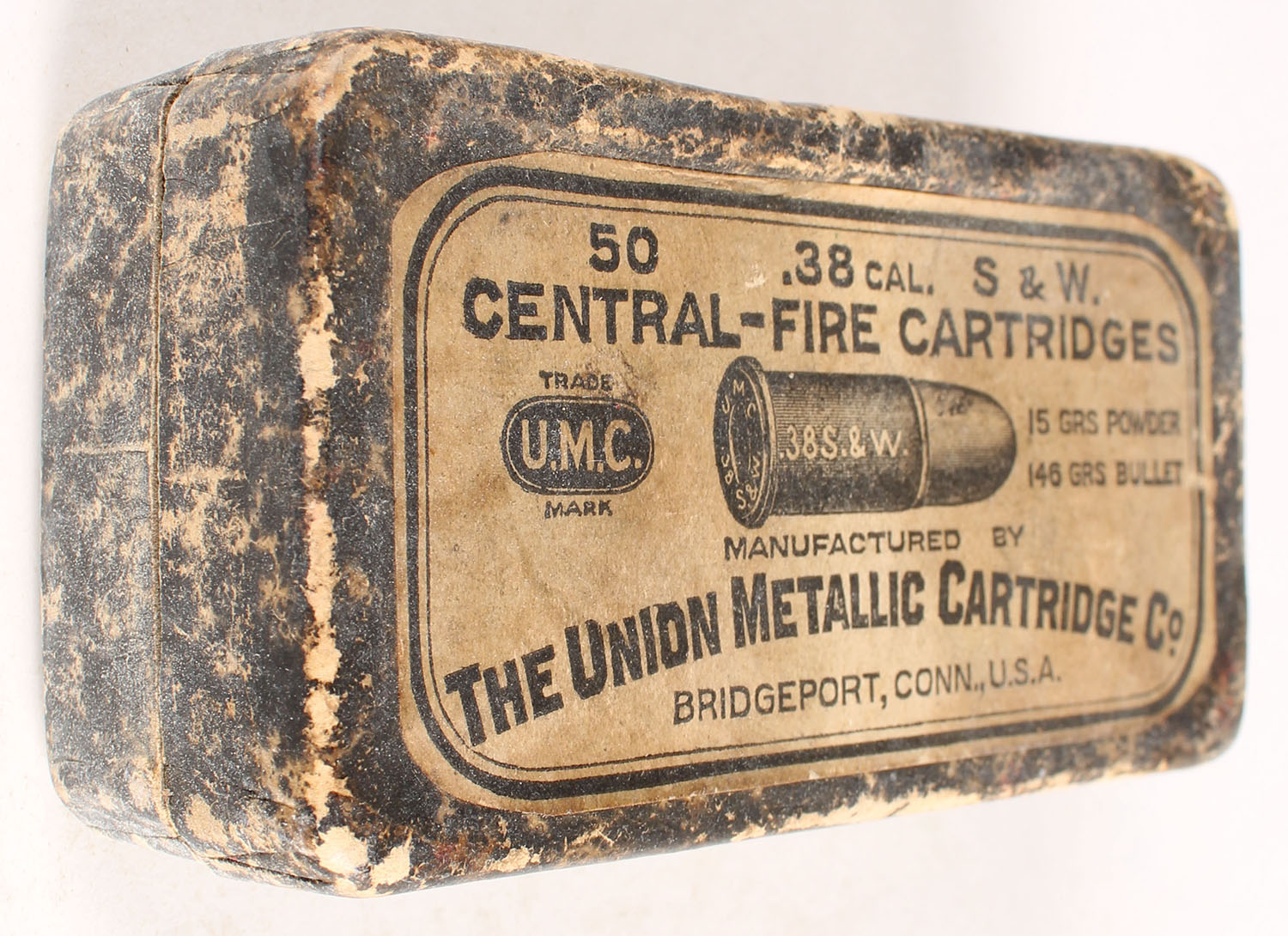 UMC, Central-Fire Cartridges, .38 Smith & Wesson, 146 Grs. Bullet, Partial 17rds. 1pc. Black mottled box with green top & side sealing labels, box is solid with good color, age soiling, some edge & corner wear, side sealing label is 5% intact, ammo is good. Grade: Good - Value: 6 to 30